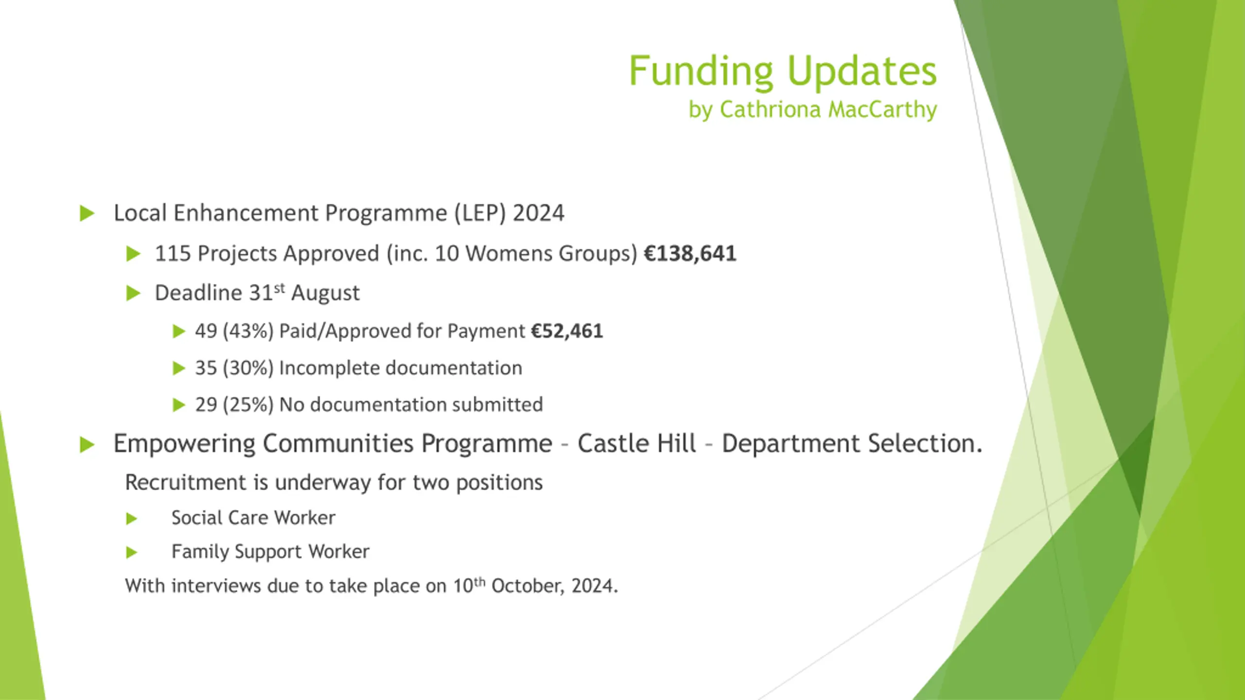 Funding Updates by Cathriona MacCarthy Local Enhancement Programme (LEP) 2024 115 Projects Approved (inc. 10 Womens Groups) 138,641 Deadline 31stAugust 49 (43%) Paid/Approved for Payment 52,461 35 (30%) Incomplete documentation 29 (25%) No documentation submitted Empowering Communities Programme Castle Hill Department Selection. Recruitment is underway for two positions Social Care Worker Family Support Worker With interviews due to take place on 10thOctober, 2024.
