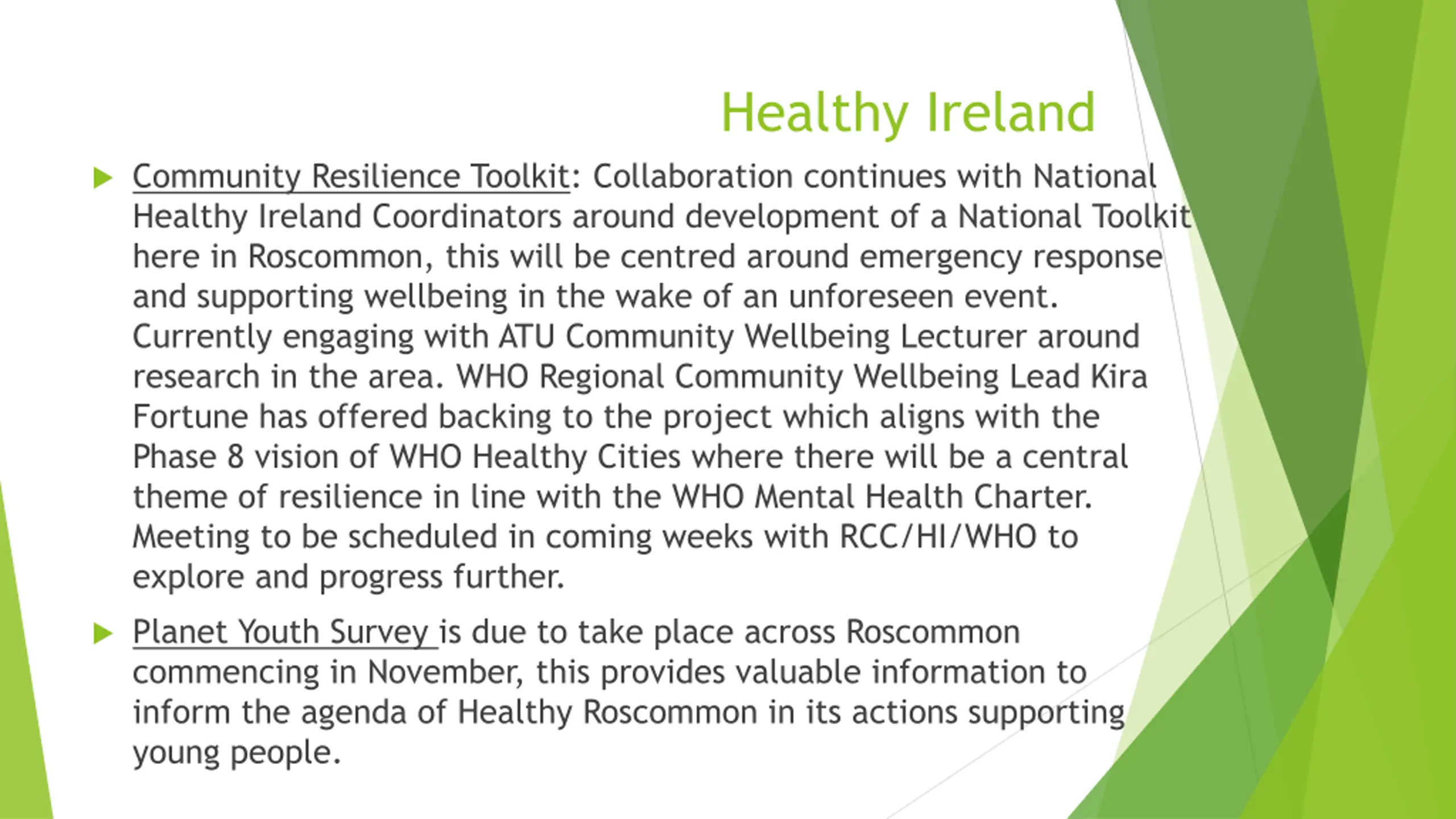 Healthy Ireland Community Resilience Toolkit: Collaboration continues with National Healthy Ireland Coordinators around development of a National Toolkit here in Roscommon, this will be centred around emergency response and supporting wellbeing in the wake of an unforeseen event. Currently engaging with ATU Community Wellbeing Lecturer around research in the area. WHO Regional Community Wellbeing Lead Kira Fortune has offered backing to the project which aligns with the Phase 8 vision of WHO Healthy Cities where there will be a central theme of resilience in line with the WHO Mental Health Charter. Meeting to be scheduled in coming weeks with RCC/HI/WHO to explore and progress further. Planet Youth Survey is due to take place across Roscommon commencing in November, this provides valuable information to inform the agenda of Healthy Roscommon in its actions supporting young people.