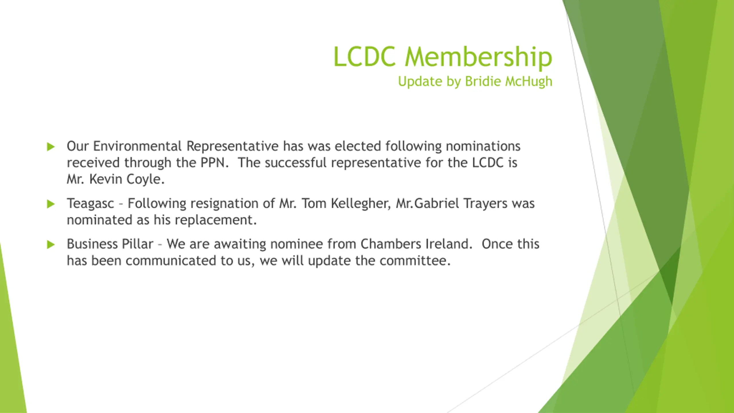LCDC Membership Update by Bridie McHugh Our Environmental Representative has was elected following nominations received through the PPN. The successful representative for the LCDC is Mr. Kevin Coyle. Teagasc Following resignation of Mr. Tom Kellegher, Mr.Gabriel Trayers was nominated as his replacement. Business Pillar We are awaiting nominee from Chambers Ireland. Once this has been communicated to us, we will update the committee.