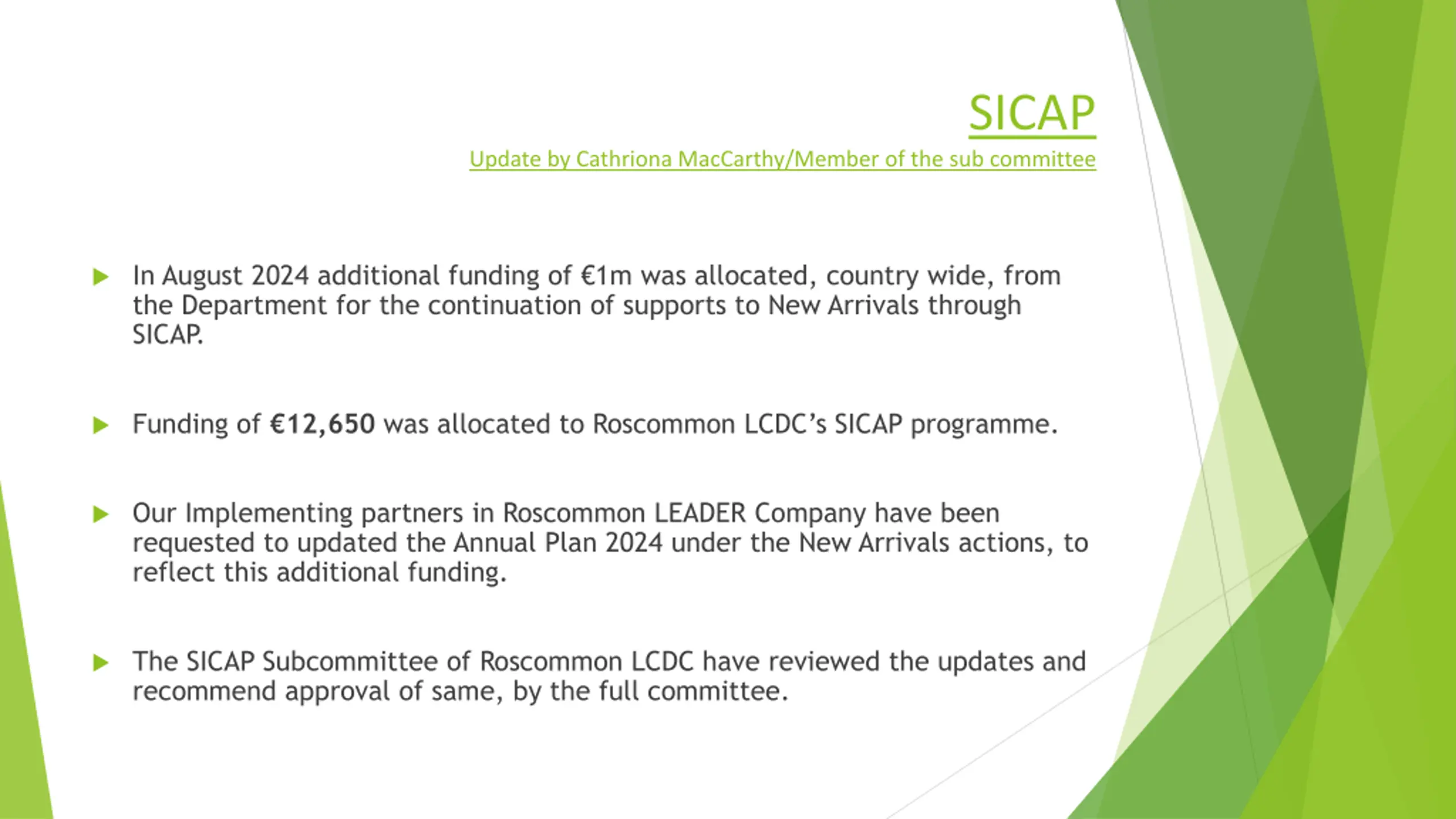 SICAP Update by Cathriona MacCarthy/Member of the sub committee In August 2024 additional funding of 1m was allocated, country wide, from the Department for the continuation of supports to New Arrivals through SICAP. Funding of 12,650 was allocated to Roscommon LCDC s SICAP programme. Our Implementing partners in Roscommon LEADER Company have been requested to updated the Annual Plan 2024 under the New Arrivals actions, to reflect this additional funding. The SICAP Subcommittee of Roscommon LCDC have reviewed the updates and recommend approval of same, by the full committee.
