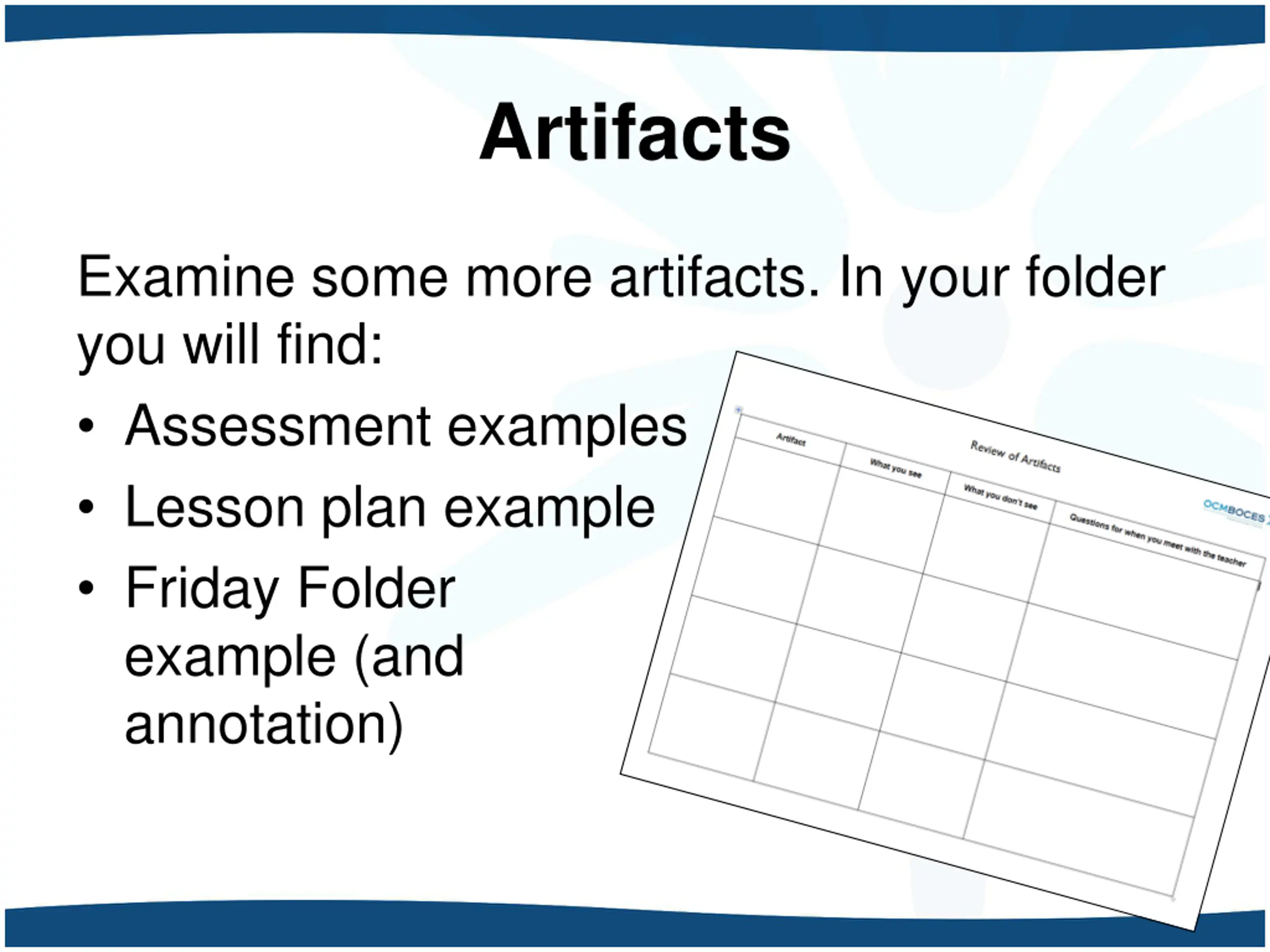 Artifacts Examine some more artifacts. In your folder you will find: Assessment examples Lesson plan example Friday Folder example (and annotation)