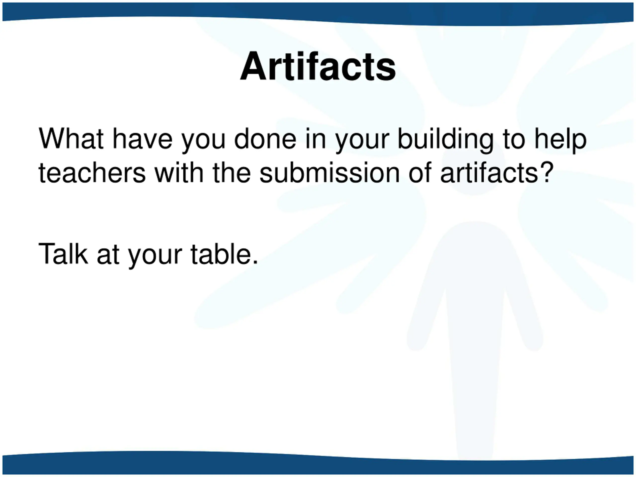 Artifacts What have you done in your building to help teachers with the submission of artifacts? Talk at your table.