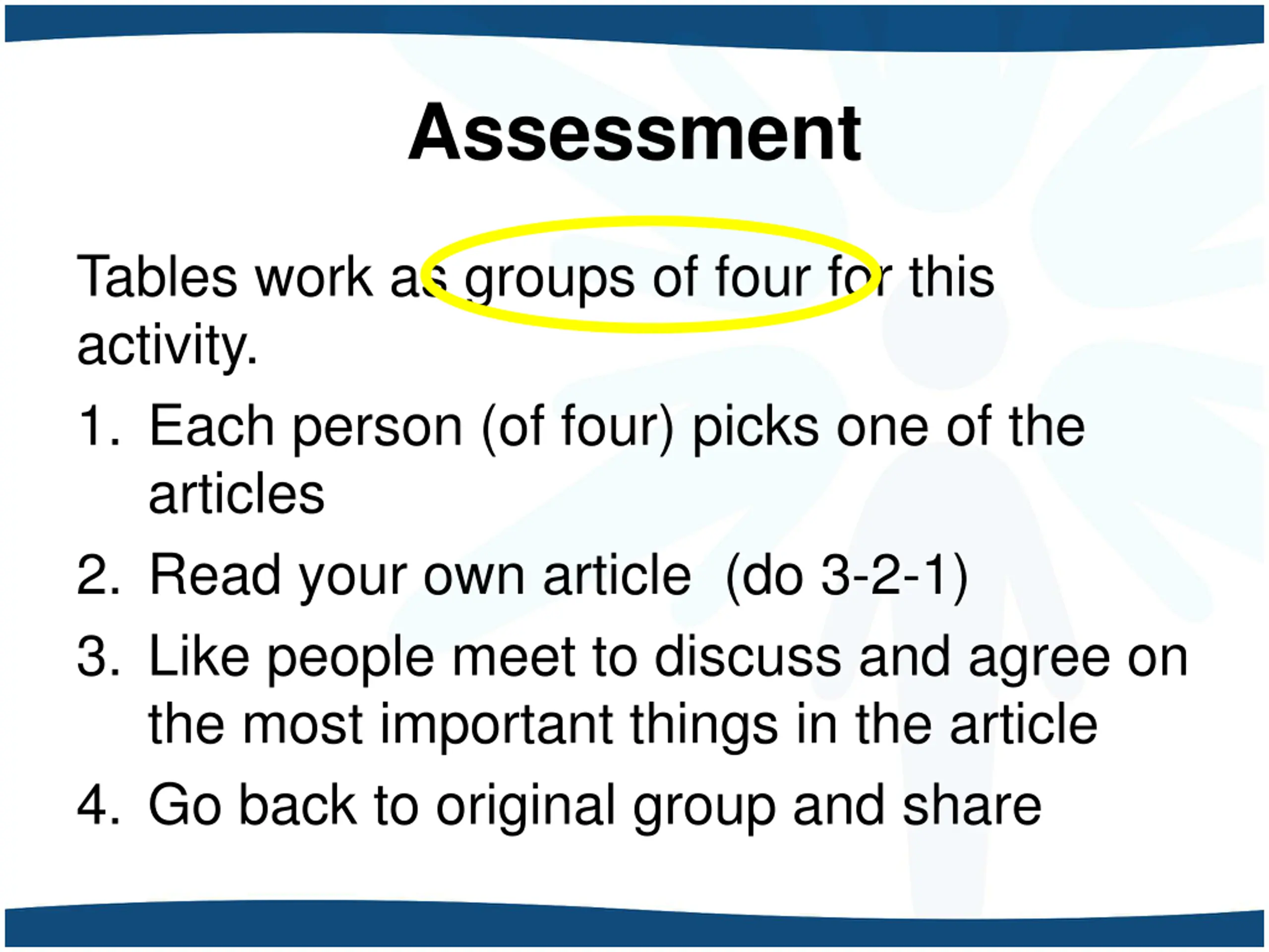 Assessment Tables work as groups of four for this activity. 1. Each person (of four) picks one of the articles 2. Read your own article (do 3-2-1) 3. Like people meet to discuss and agree on the most important things in the article 4. Go back to original group and share