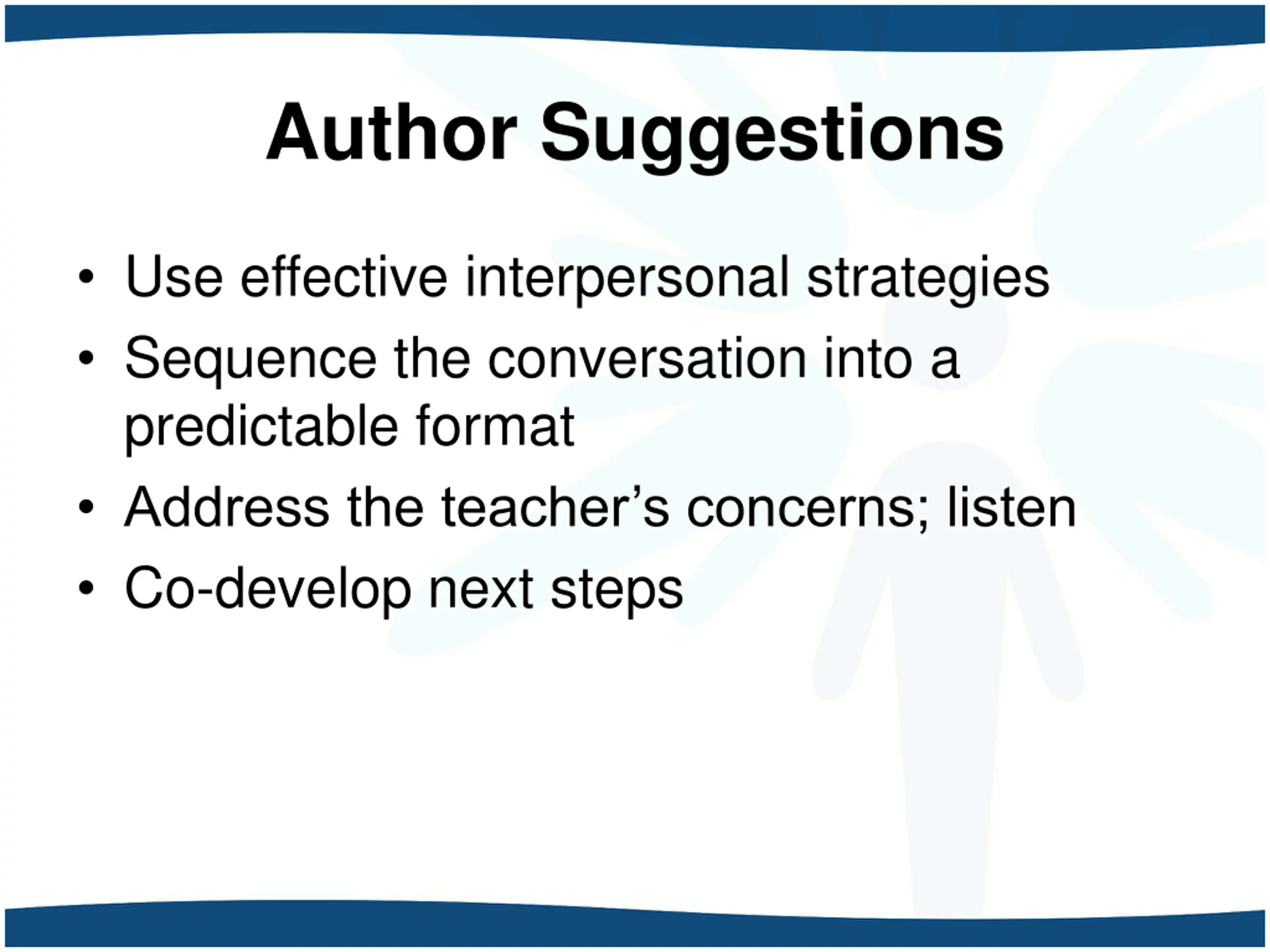 Author Suggestions Use effective interpersonal strategies Sequence the conversation into a predictable format Address the teacher s concerns; listen Co-develop next steps