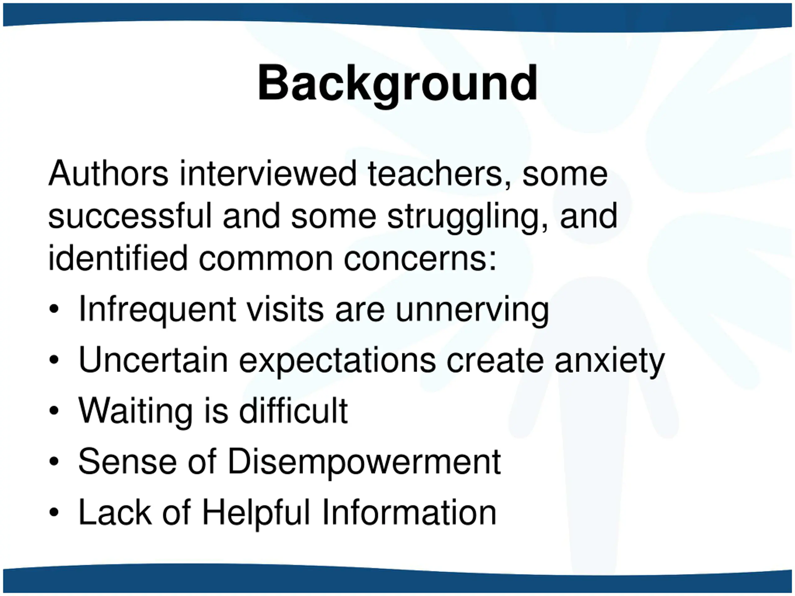 Background Authors interviewed teachers, some successful and some struggling, and identified common concerns: Infrequent visits are unnerving Uncertain expectations create anxiety Waiting is difficult Sense of Disempowerment Lack of Helpful Information