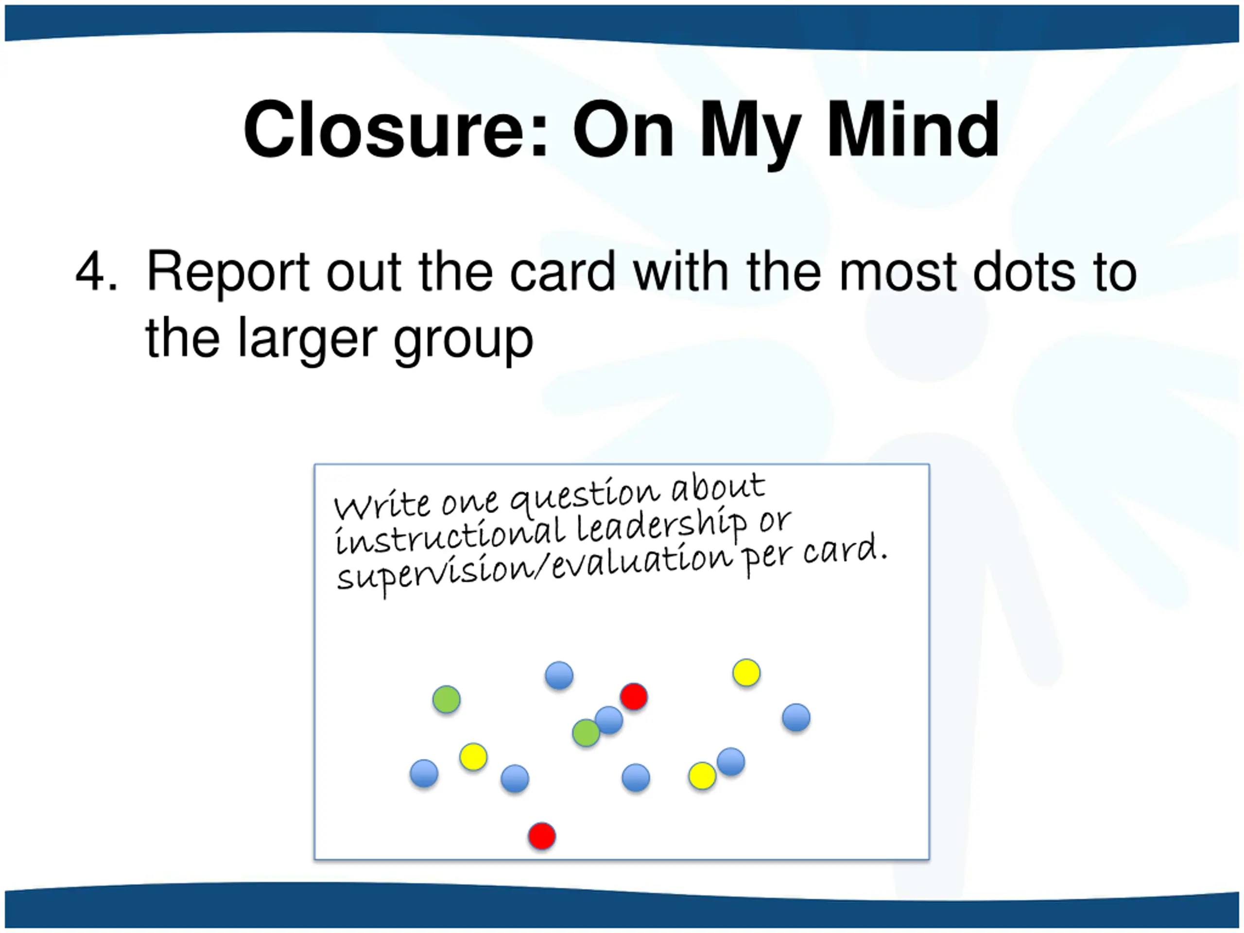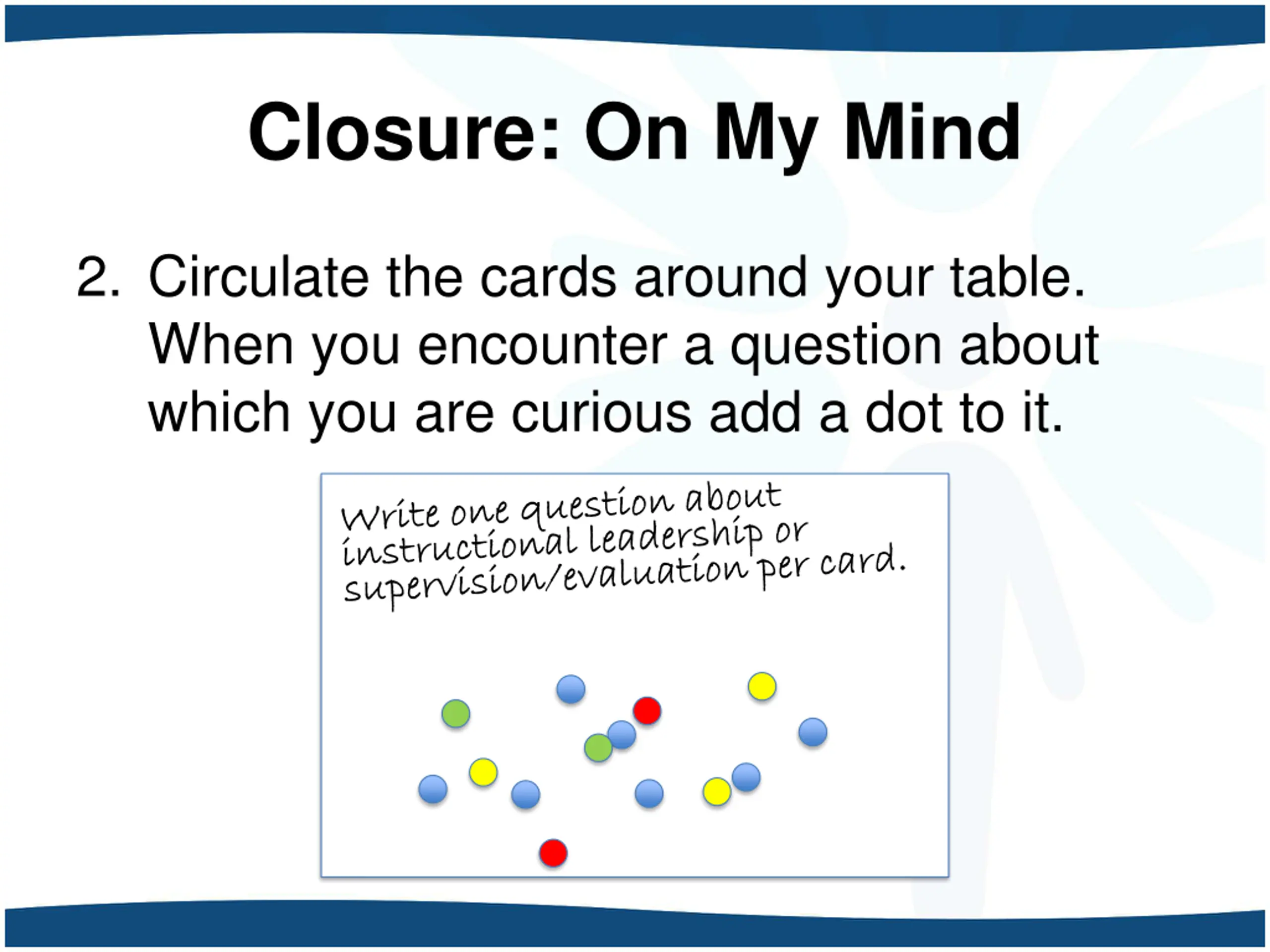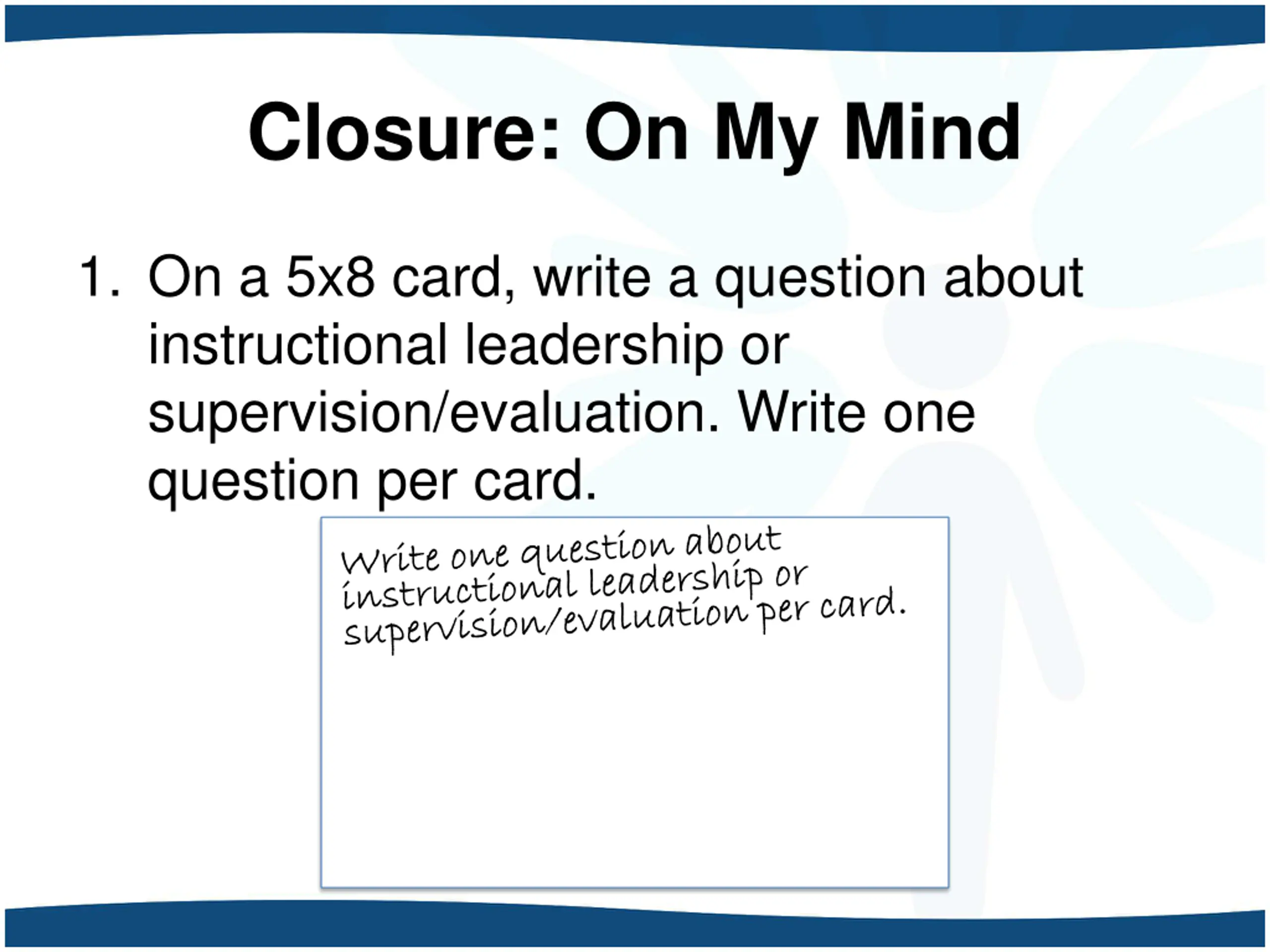 Closure: On My Mind 1. On a 5x8 card, write a question about instructional leadership or supervision/evaluation. Write one question per card.