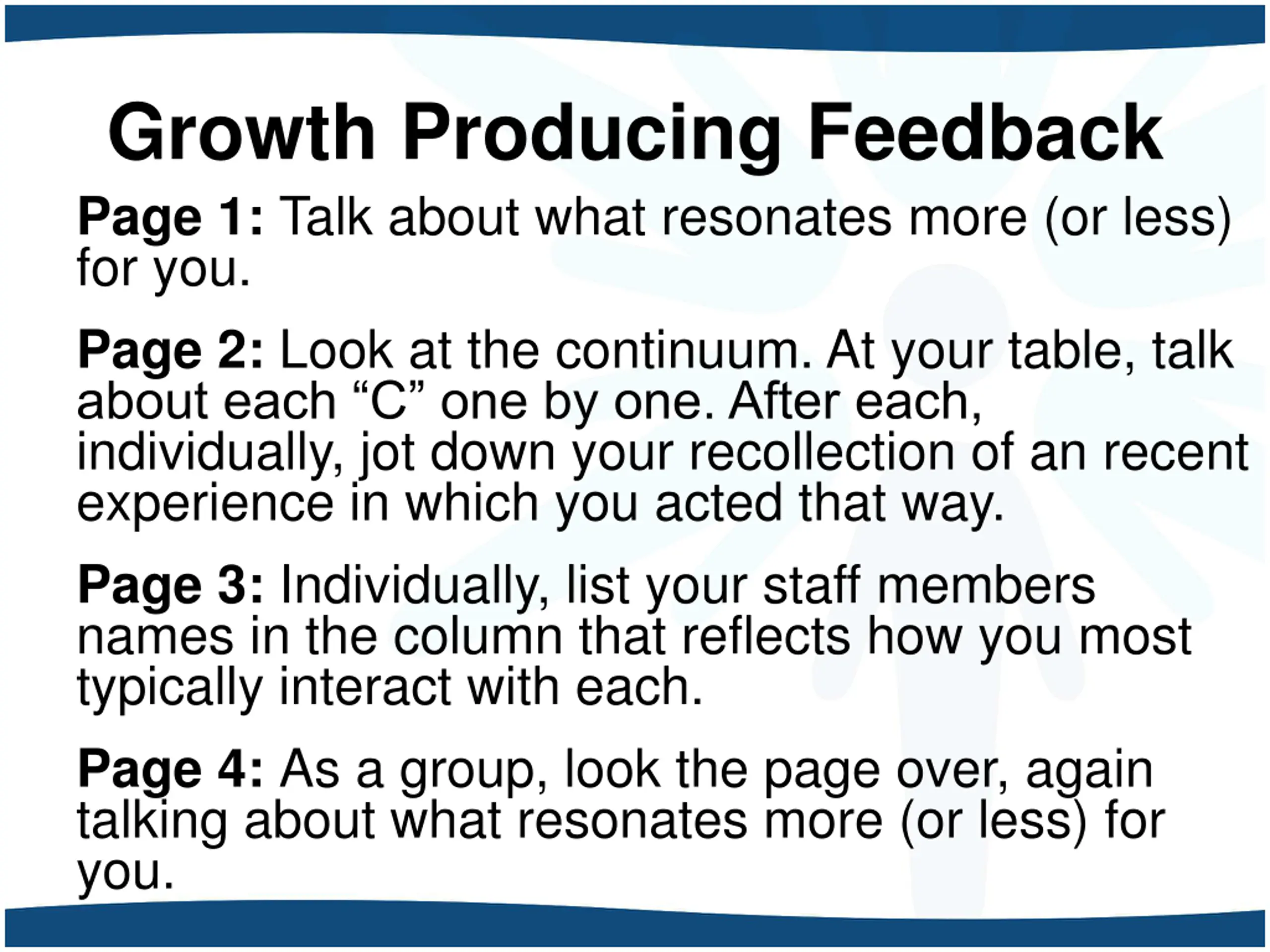 Growth Producing Feedback Page 1: Talk about what resonates more (or less) for you. Page 2: Look at the continuum. At your table, talk about each C one by one. After each, individually, jot down your recollection of an recent experience in which you acted that way. Page 3: Individually, list your staff members names in the column that reflects how you most typically interact with each. Page 4: As a group, look the page over, again talking about what resonates more (or less) for you.