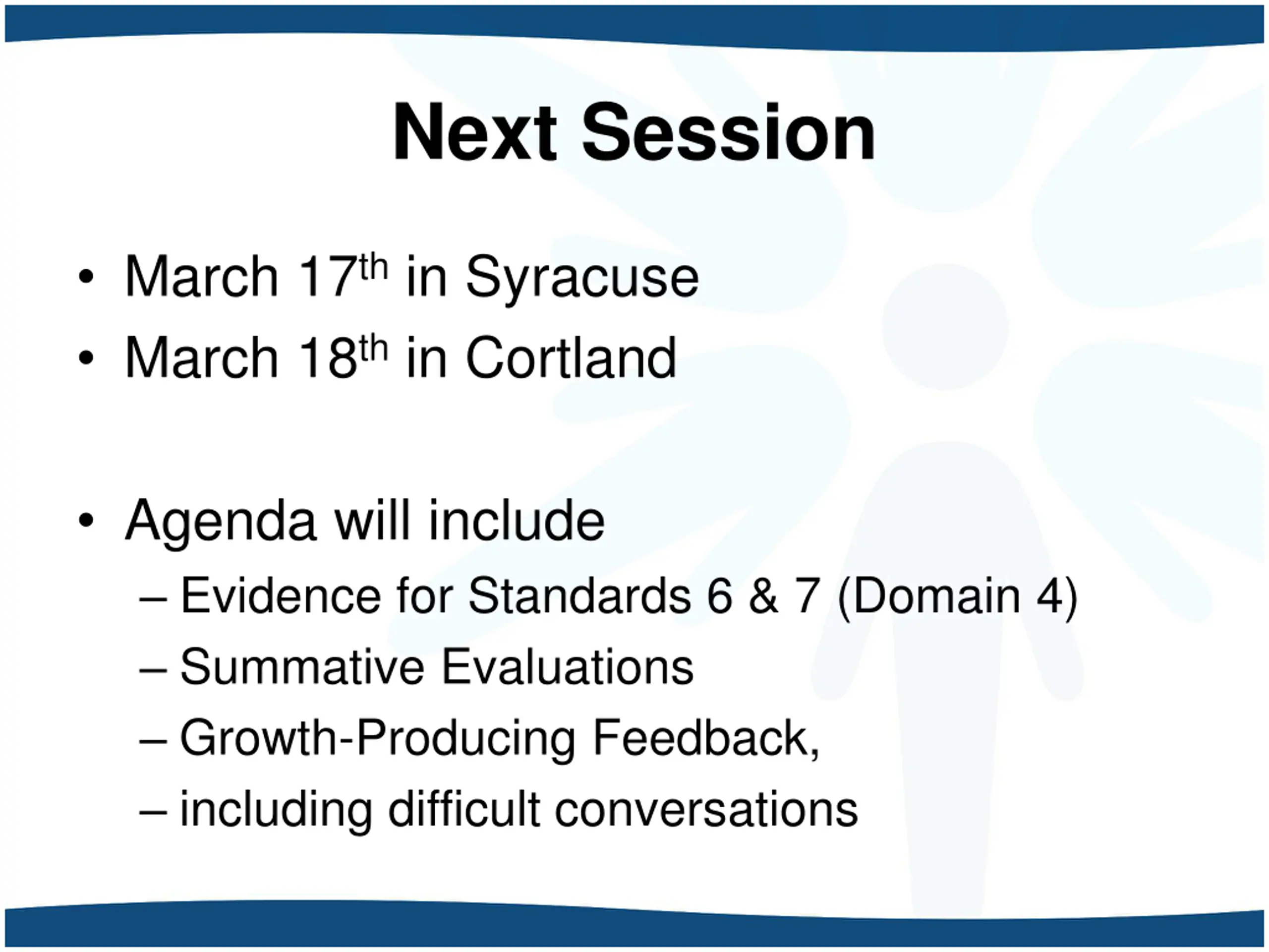 Next Session March 17th in Syracuse March 18th in Cortland Agenda will include Evidence for Standards 6 & 7 (Domain 4) Summative Evaluations Growth-Producing Feedback, including difficult conversations