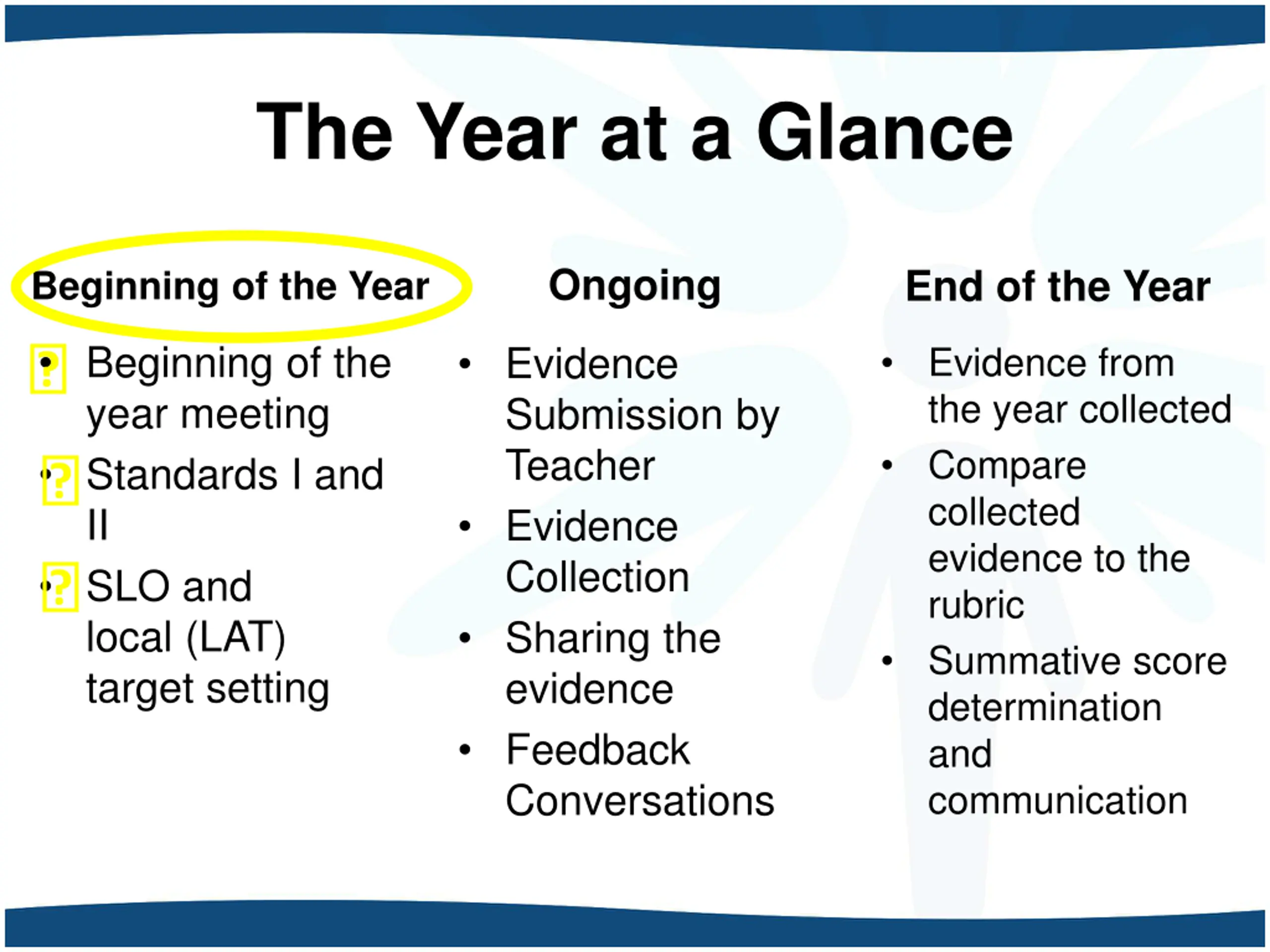 The Year at a Glance Ongoing End of the Year Beginning of the Year Beginning of the year meeting Standards I and II SLO and local (LAT) target setting Evidence Submission by Teacher Evidence Collection Sharing the evidence Feedback Conversations Evidence from the year collected Compare collected evidence to the rubric Summative score determination and communication