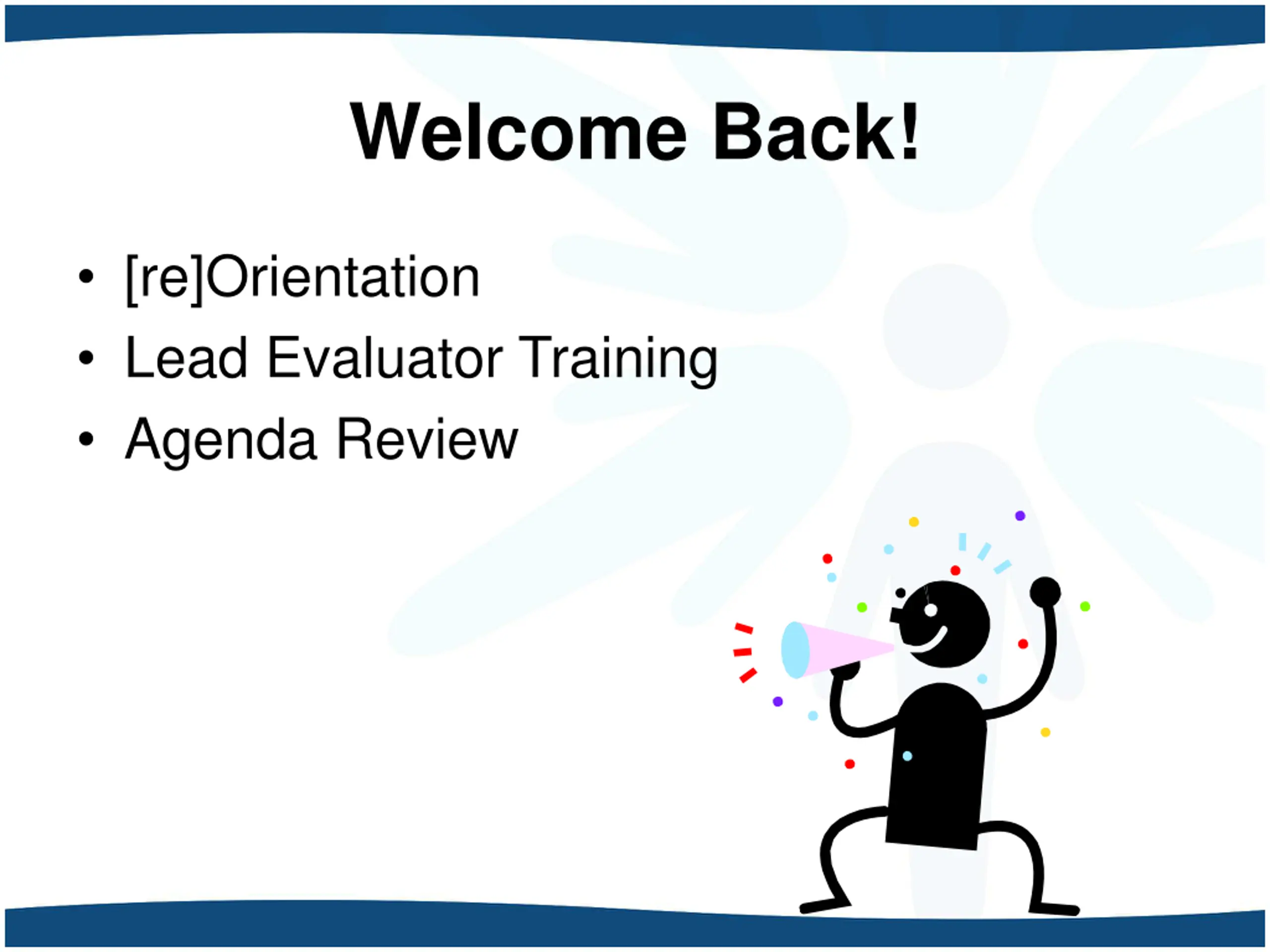 Welcome Back! [re]Orientation Lead Evaluator Training Agenda Review