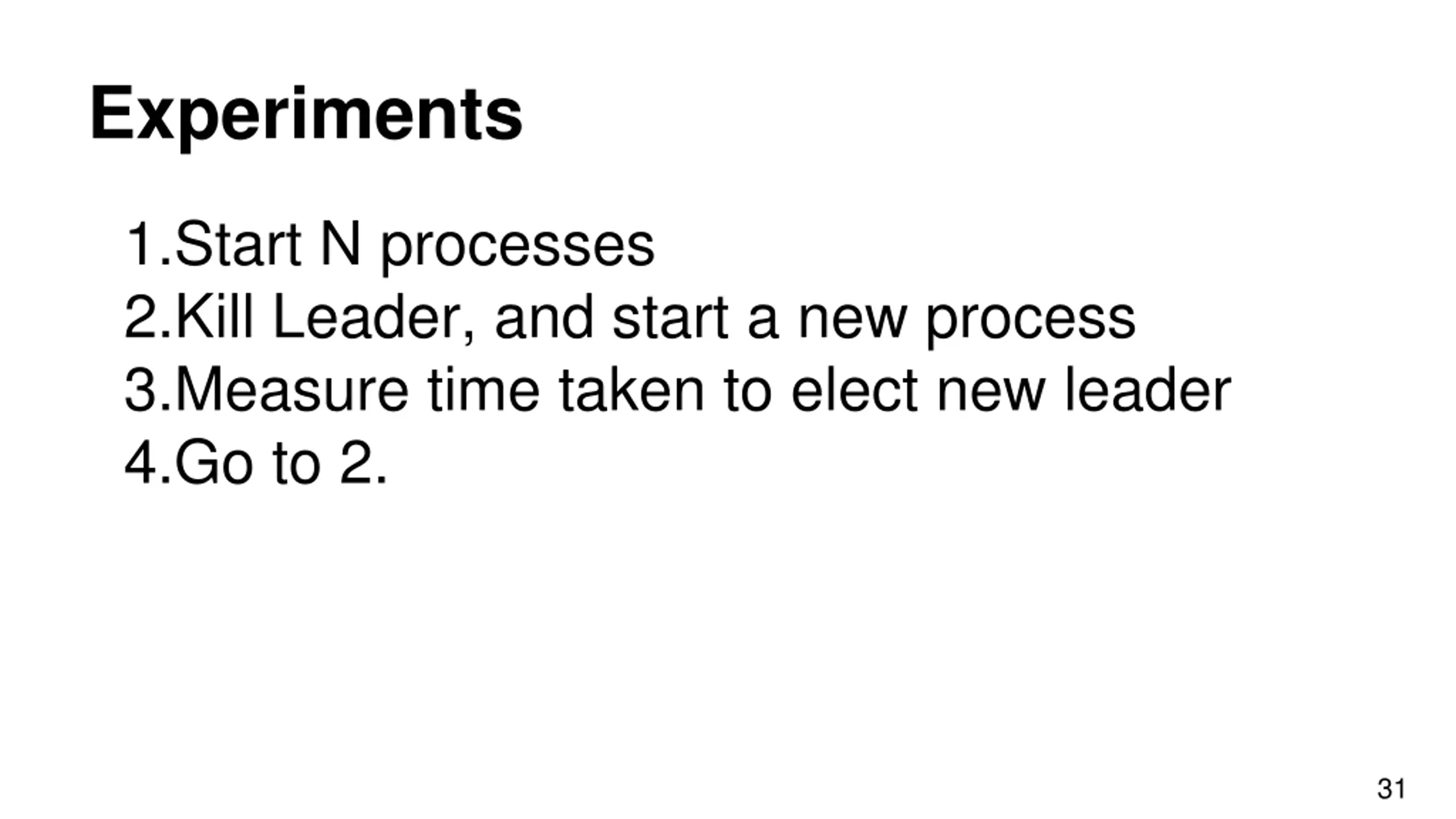 Experiments 1.Start N processes 2.Kill Leader, and start a new process 3.Measure time taken to elect new leader 4.Go to 2. 31