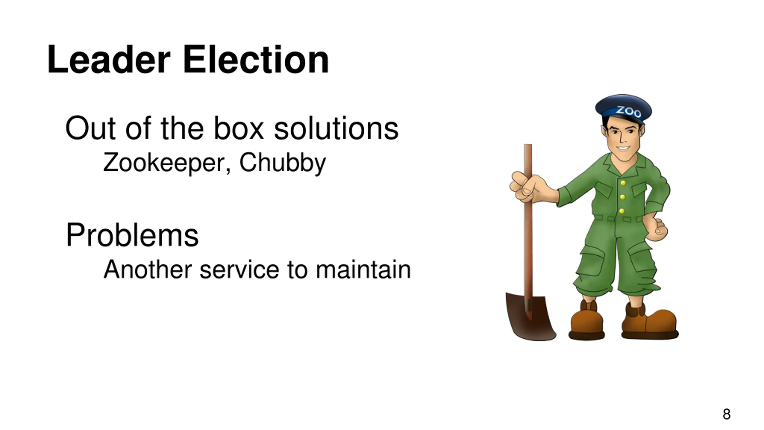 Leader Election Out of the box solutions Zookeeper, Chubby Problems Another service to maintain 8