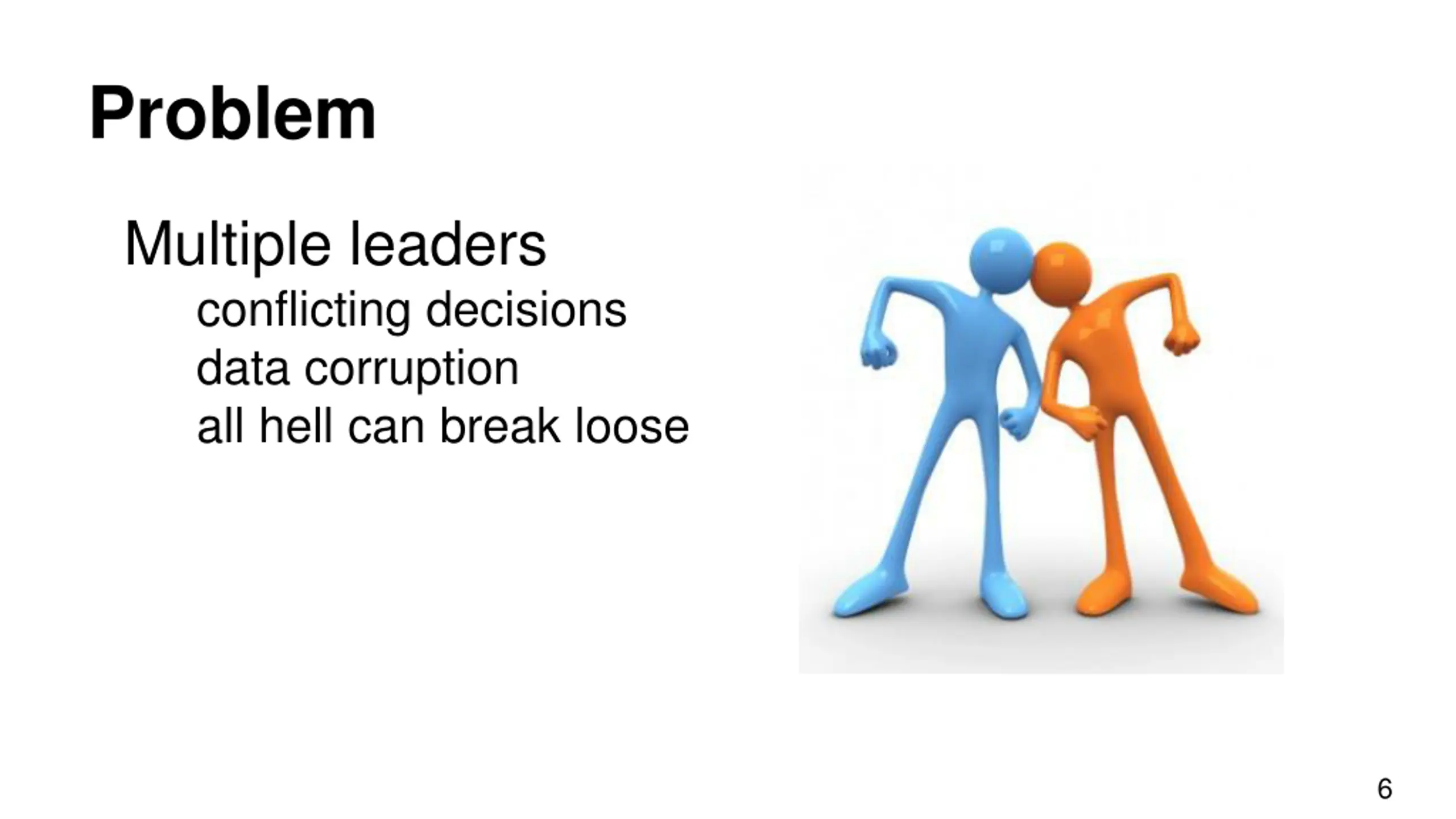 Problem Multiple leaders conflicting decisions data corruption all hell can break loose 6