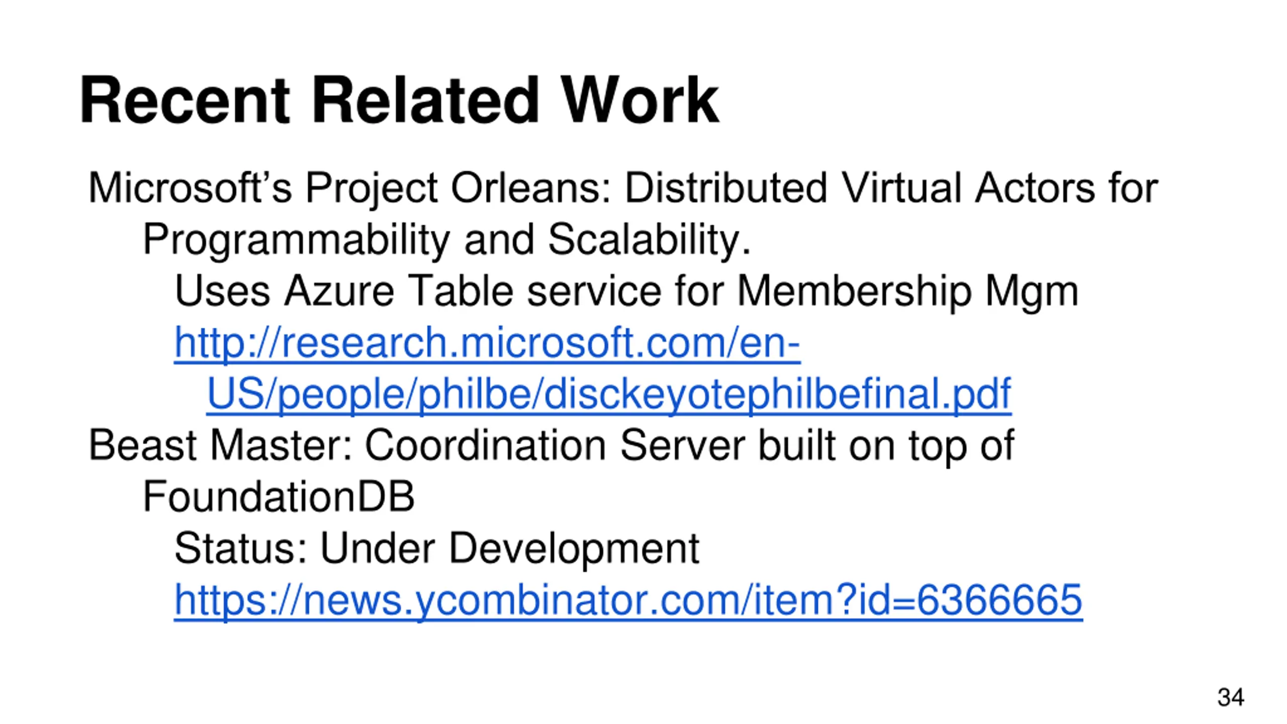 Recent Related Work Microsoft s Project Orleans: Distributed Virtual Actors for Programmability and Scalability. Uses Azure Table service for Membership Mgm http://research.microsoft.com/en- US/people/philbe/disckeyotephilbefinal.pdf Beast Master: Coordination Server built on top of FoundationDB Status: Under Development https://news.ycombinator.com/item?id=6366665 34