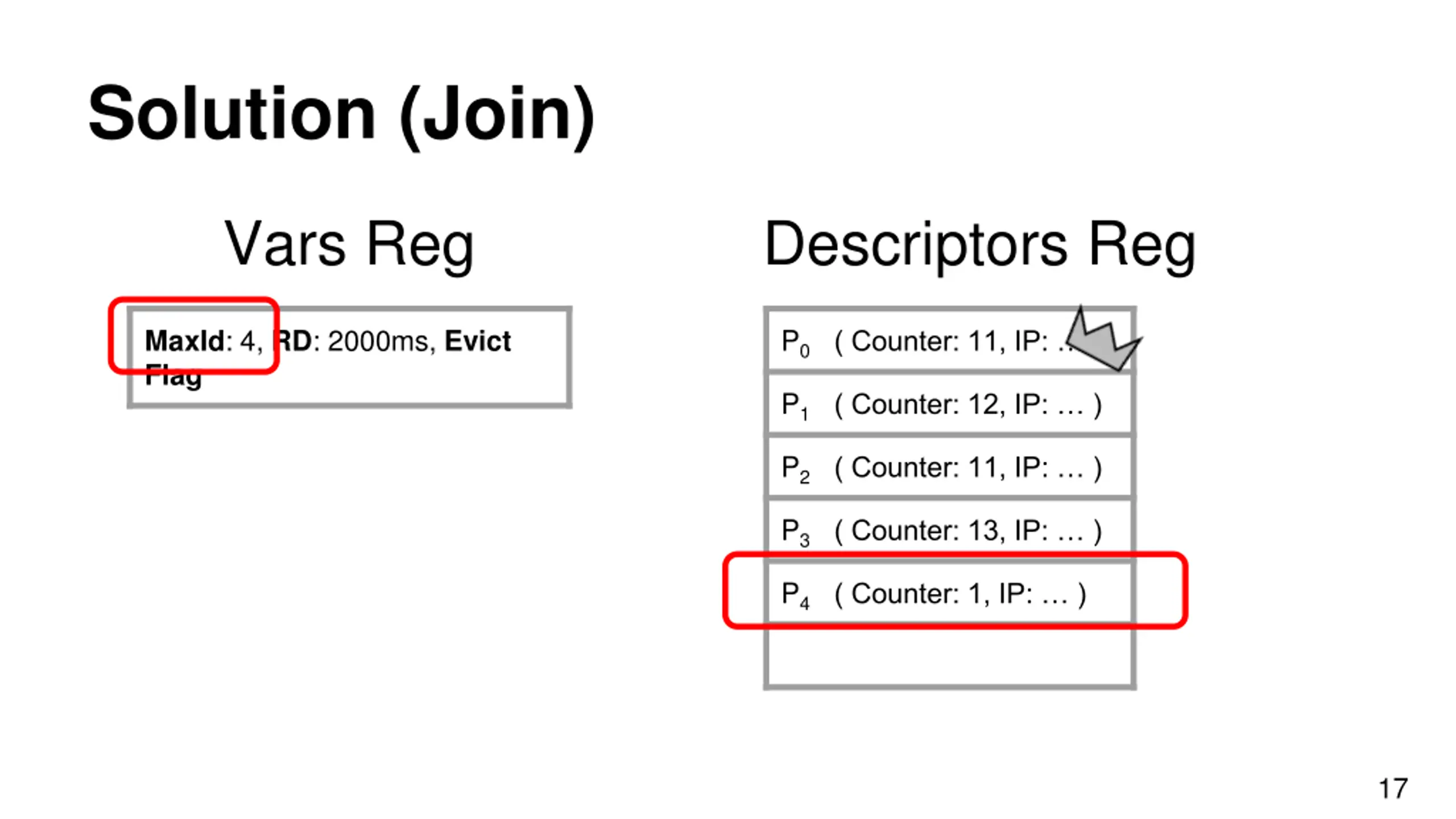 Solution (Join) Vars Reg Descriptors Reg MaxId: 4, RD: 2000ms, Evict Flag P0 ( Counter: 11, IP: ) P1 ( Counter: 12, IP: ) P2 ( Counter: 11, IP: ) P3 ( Counter: 13, IP: ) P4 ( Counter: 1, IP: ) 17