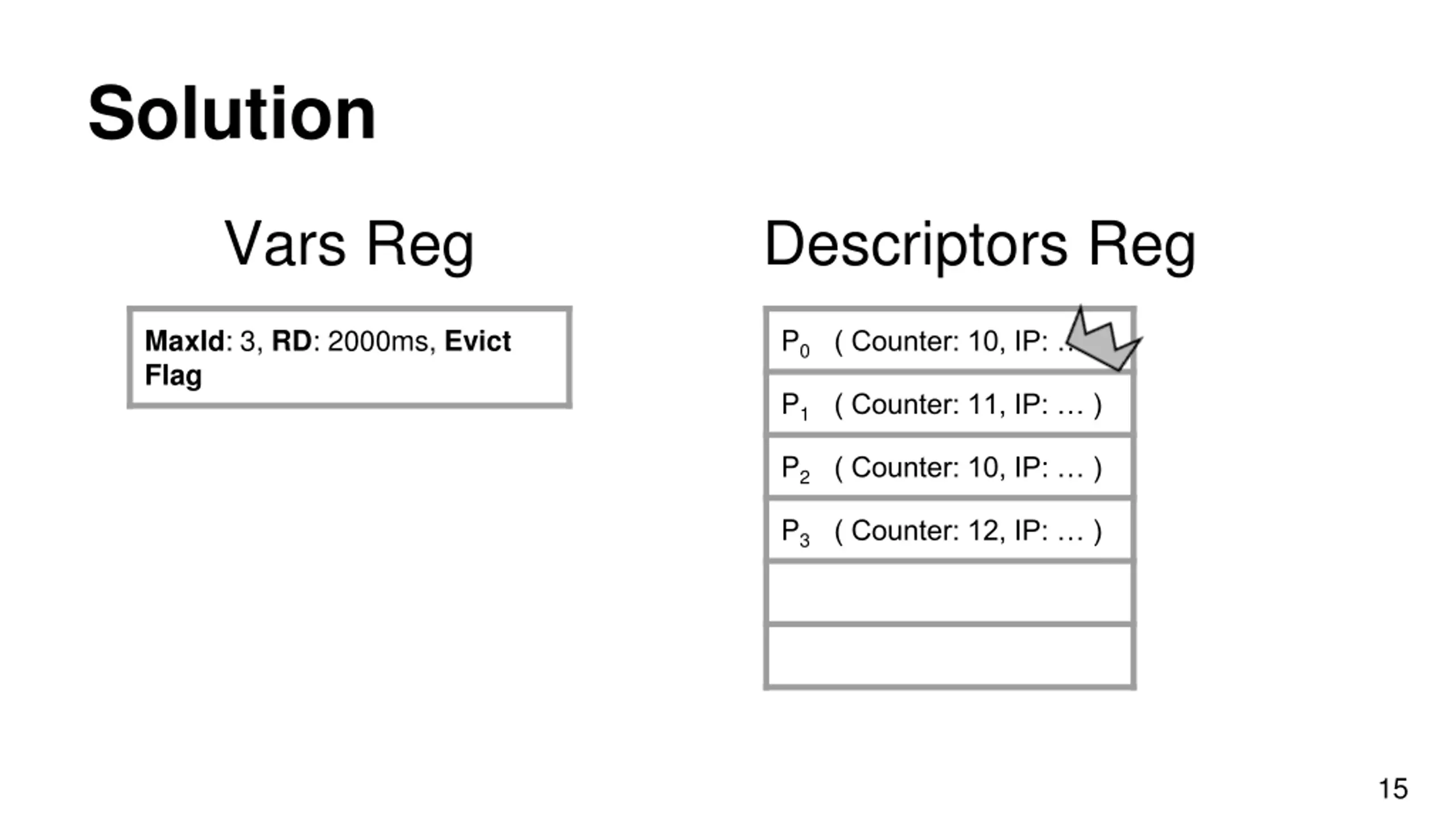 Solution Vars Reg Descriptors Reg MaxId: 3, RD: 2000ms, Evict Flag P0 ( Counter: 10, IP: ) P1 ( Counter: 11, IP: ) P2 ( Counter: 10, IP: ) P3 ( Counter: 12, IP: ) 15