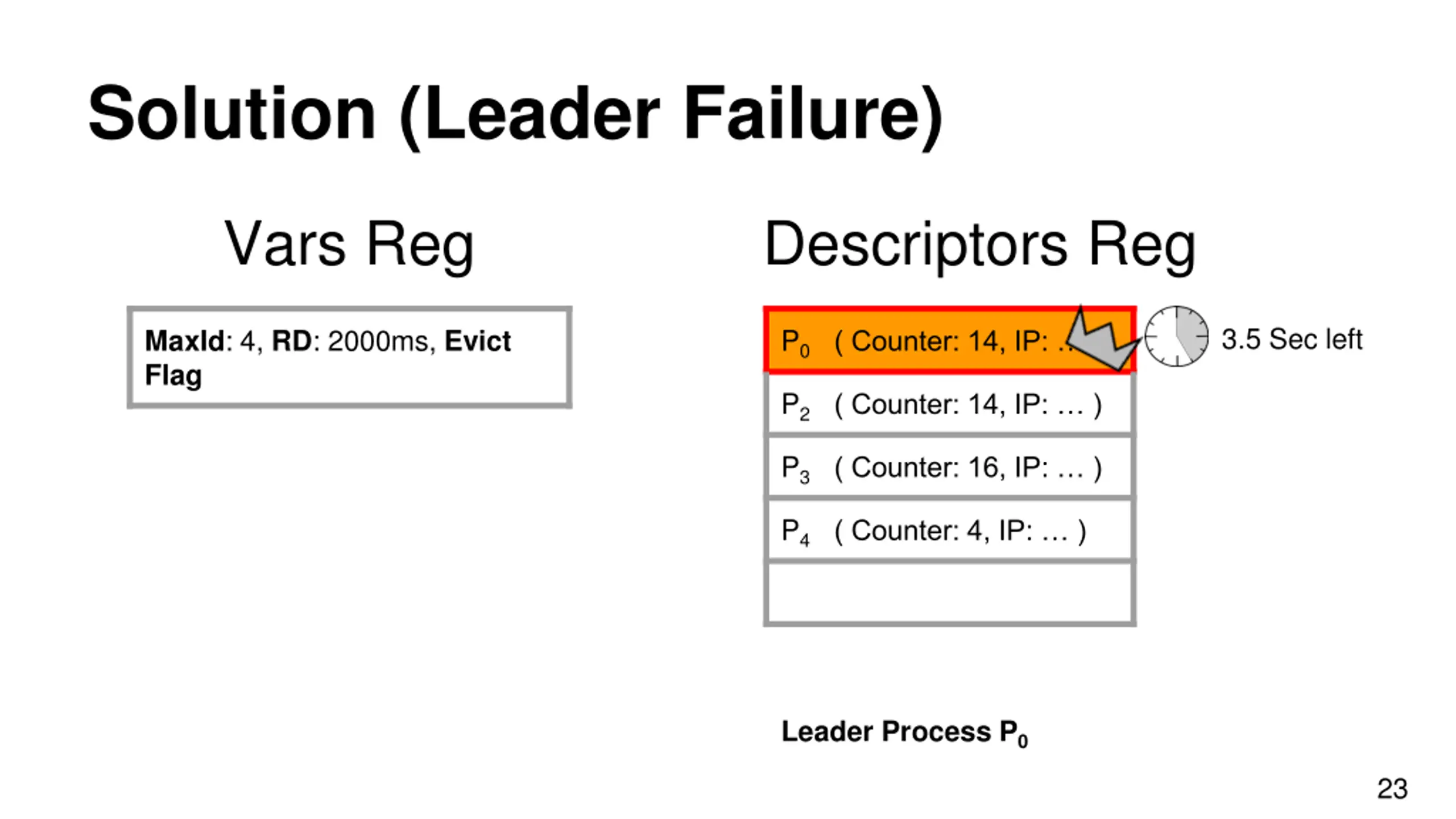 Solution (Leader Failure) Vars Reg Descriptors Reg 3.5 Sec left MaxId: 4, RD: 2000ms, Evict Flag P0 ( Counter: 14, IP: ) P2 ( Counter: 14, IP: ) P3 ( Counter: 16, IP: ) P4 ( Counter: 4, IP: ) Leader Process P0 22
