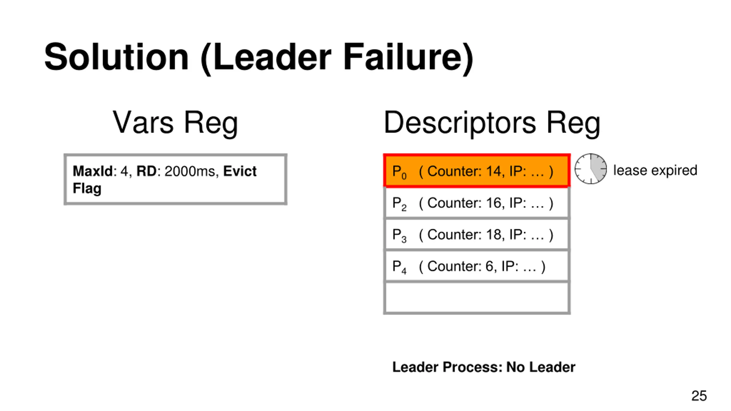 Solution (Leader Failure) Vars Reg Descriptors Reg 1.5 Sec left MaxId: 4, RD: 2000ms, Evict Flag P0 ( Counter: 14, IP: ) P2 ( Counter: 15, IP: ) P3 ( Counter: 17, IP: ) P4 ( Counter: 5, IP: ) Leader Process P0 24