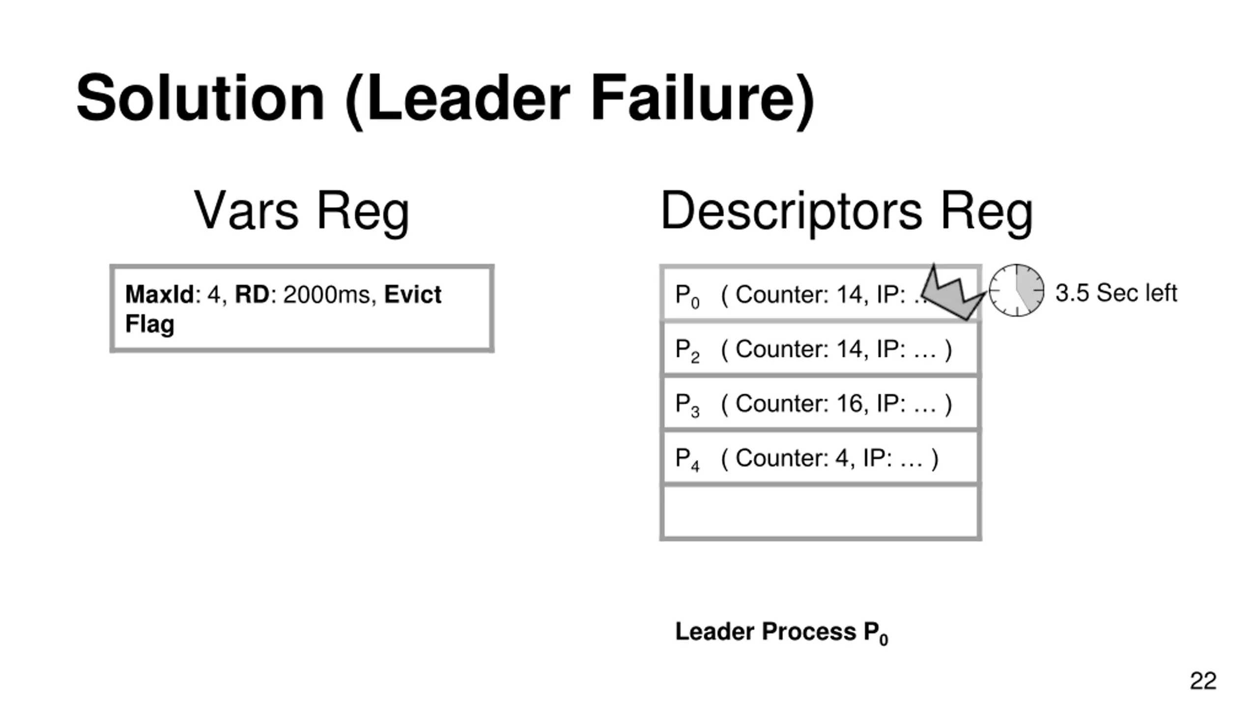 Solution (Non - Leader Failure) Vars Reg Descriptors Reg MaxId: 4, RD: 2000ms, Evict Flag P0 ( Counter: 14, IP: ) P2 ( Counter: 14, IP: ) P3 ( Counter: 16, IP: ) P4 ( Counter: 4, IP: ) 21