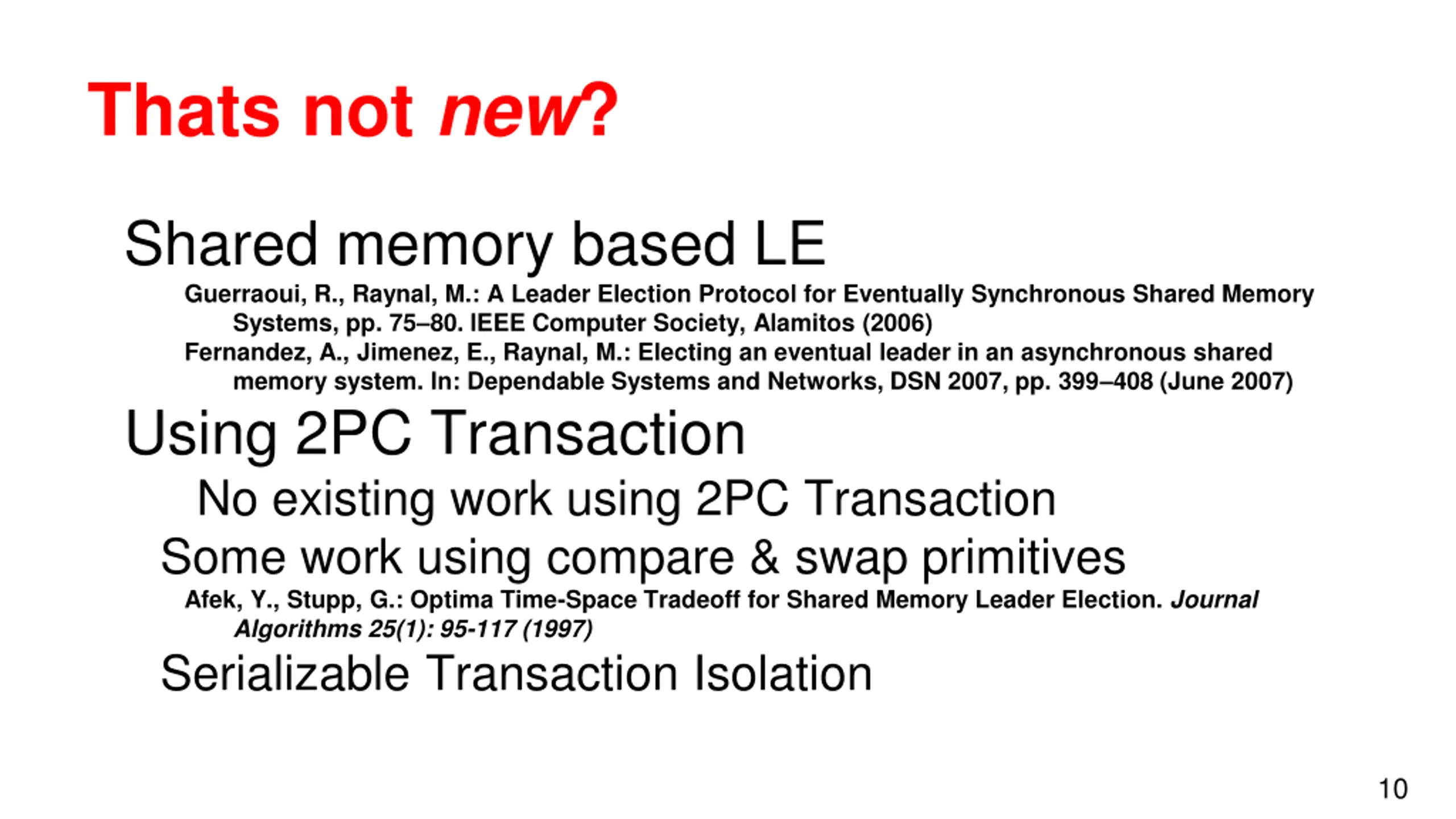 Thats not new? Shared memory based LE Guerraoui, R., Raynal, M.: A Leader Election Protocol for Eventually Synchronous Shared Memory Systems, pp. 75 80. IEEE Computer Society, Alamitos (2006) Fernandez, A., Jimenez, E., Raynal, M.: Electing an eventual leader in an asynchronous shared memory system. In: Dependable Systems and Networks, DSN 2007, pp. 399 408 (June 2007) Using 2PC Transaction No existing work using 2PC Transaction Some work using compare & swap primitives Afek, Y., Stupp, G.: Optima Time-Space Tradeoff for Shared Memory Leader Election. Journal Algorithms 25(1): 95-117 (1997) Serializable Transaction Isolation 10