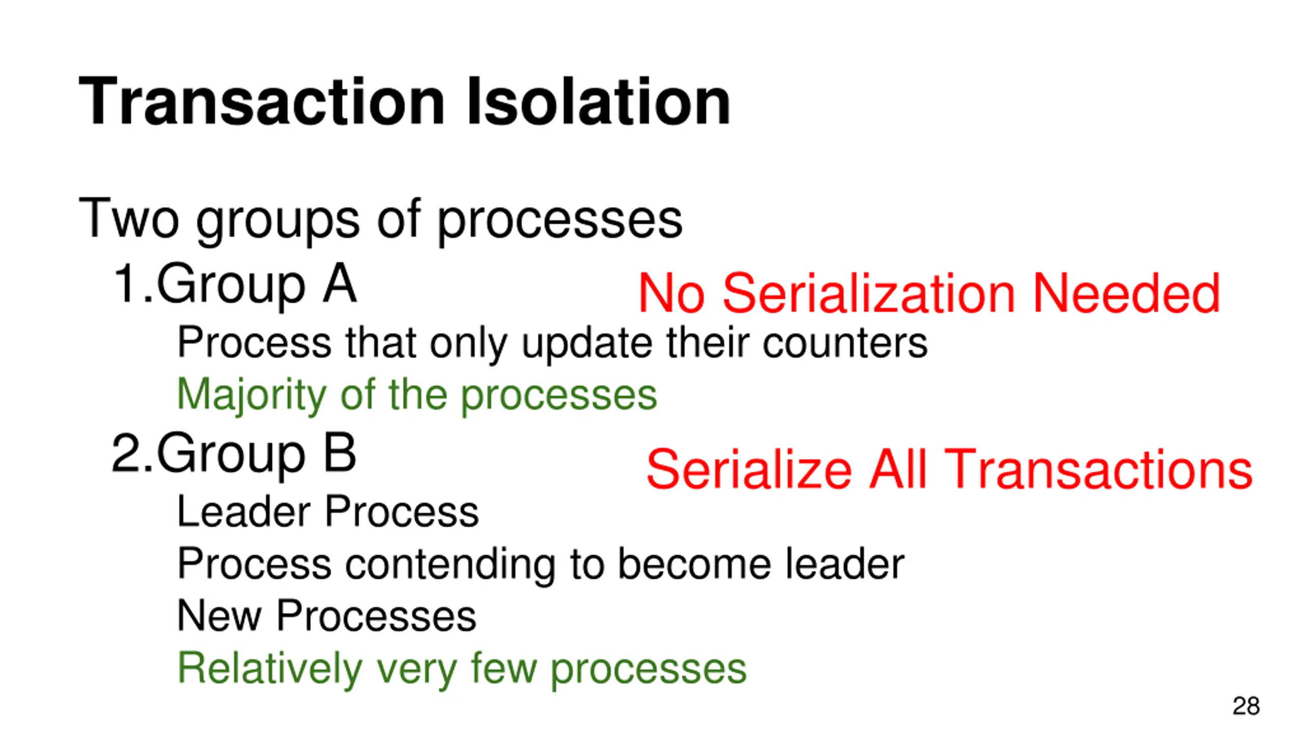 Transaction Isolation Two groups of processes 1.Group A Process that only update their counters Majority of the processes 2.Group B Leader Process Process contending to become leader New Processes Relatively very few processes No Serialization Needed Serialize All Transactions 28