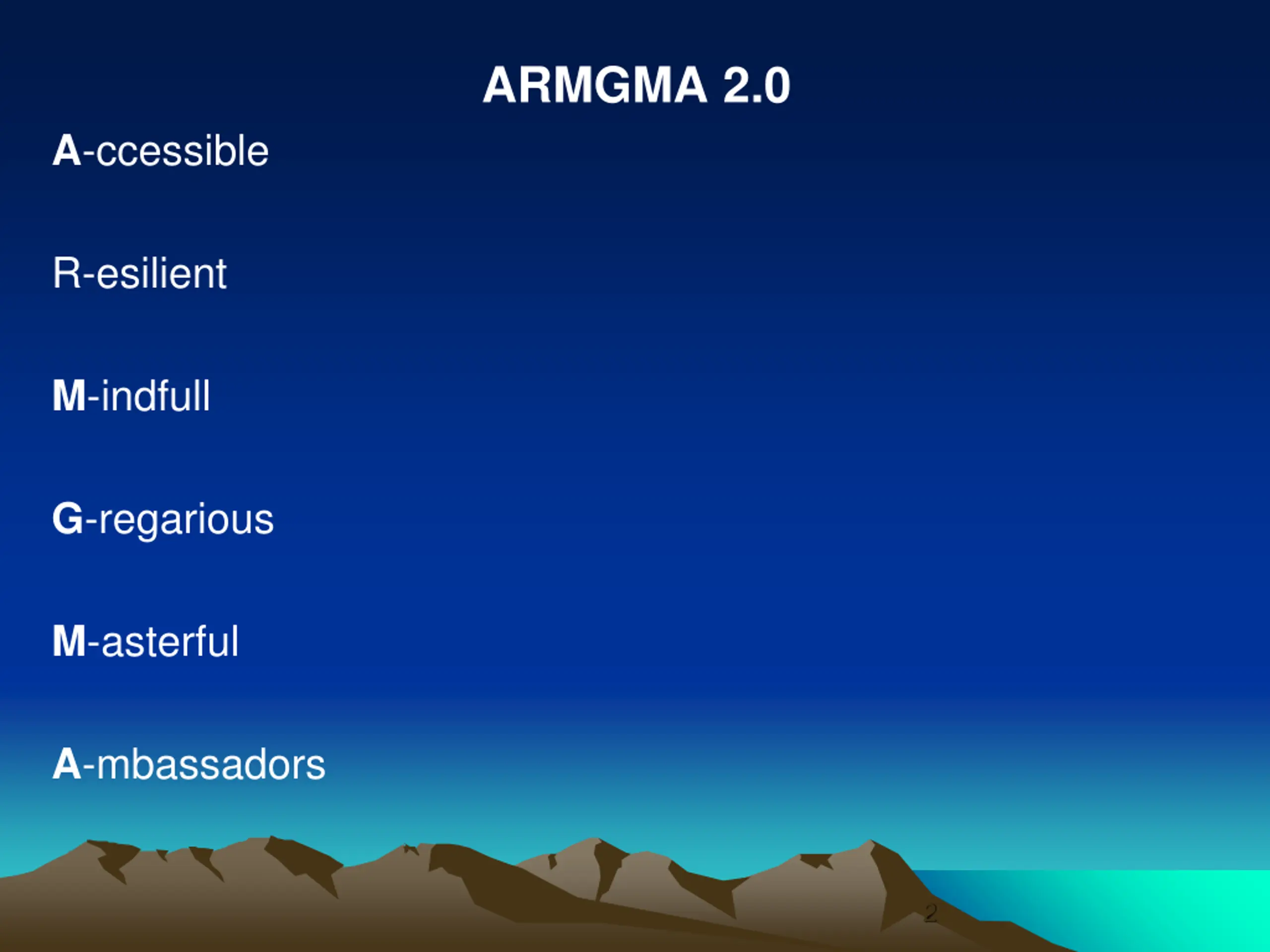 ARMGMA 2.0 A-ccessible R-esilient M-indfull G-regarious M-asterful A-mbassadors 2