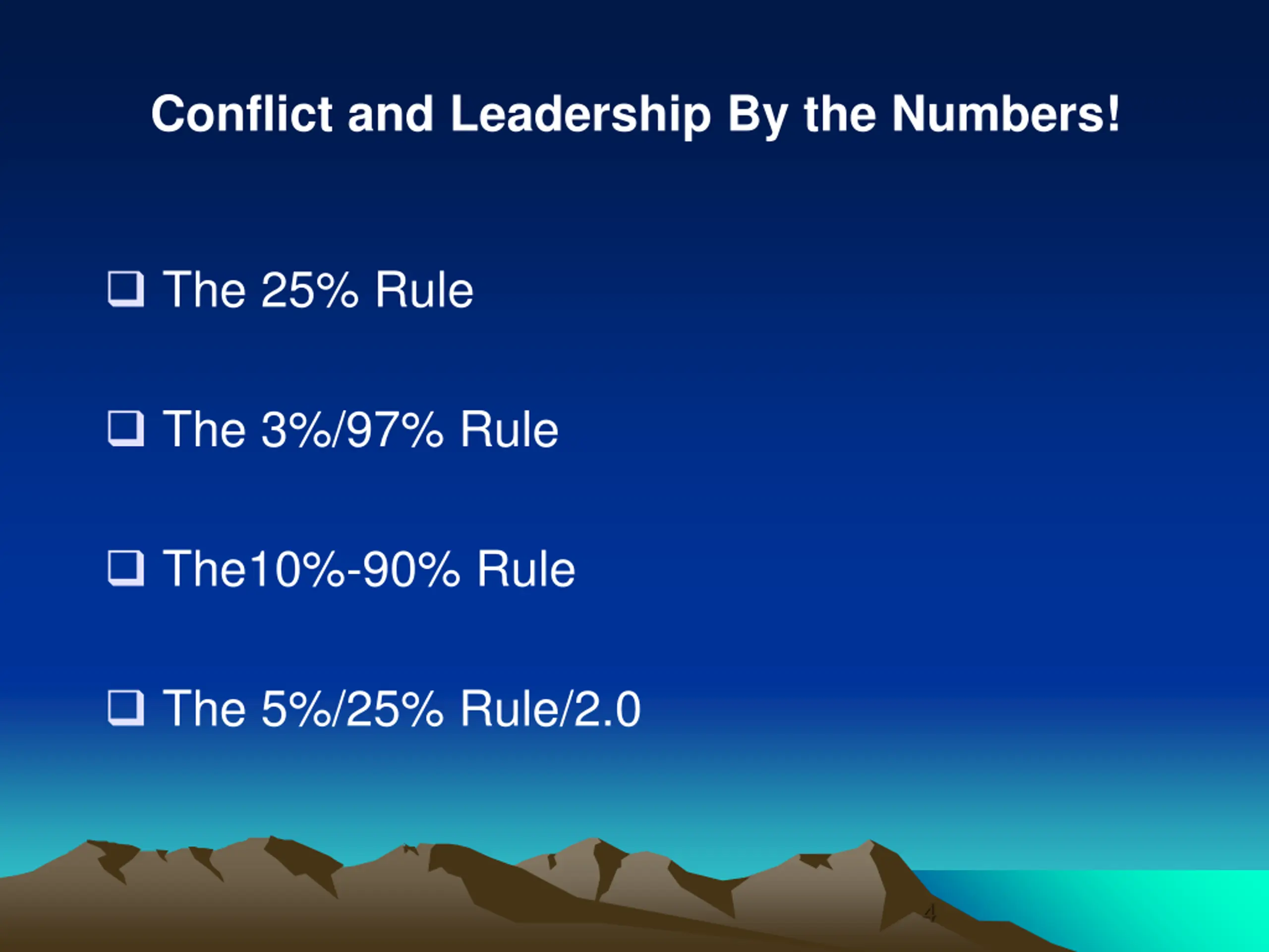 Conflict and Leadership By the Numbers! The 25% Rule The 3%/97% Rule The10%-90% Rule The 5%/25% Rule/2.0 4