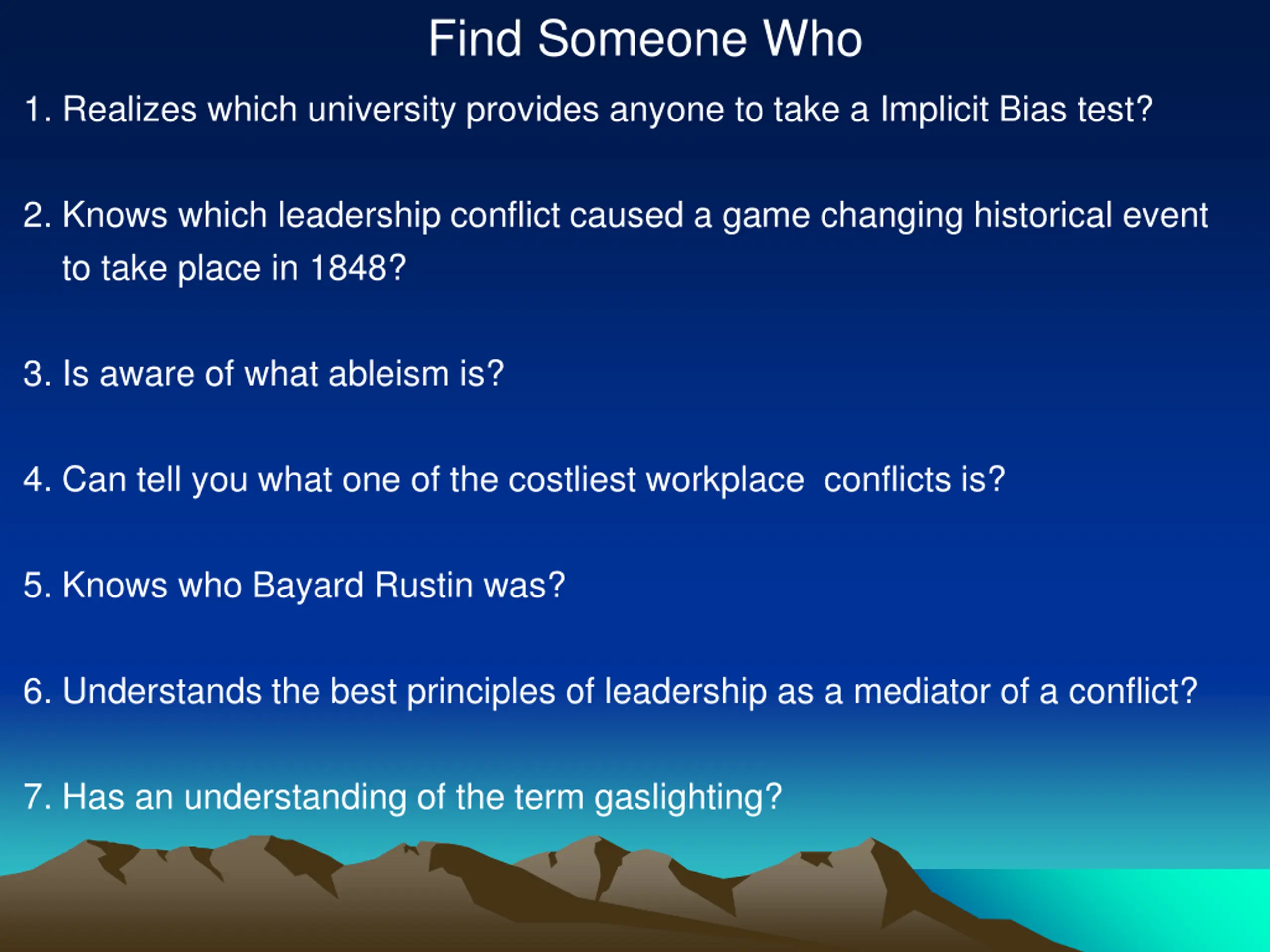 Find Someone Who 1. Realizes which university provides anyone to take a Implicit Bias test? 2. Knows which leadership conflict caused a game changing historical event to take place in 1848? 3. Is aware of what ableism is? 4. Can tell you what one of the costliest workplace conflicts is? 5. Knows who Bayard Rustin was? 6. Understands the best principles of leadership as a mediator of a conflict? 7. Has an understanding of the term gaslighting?