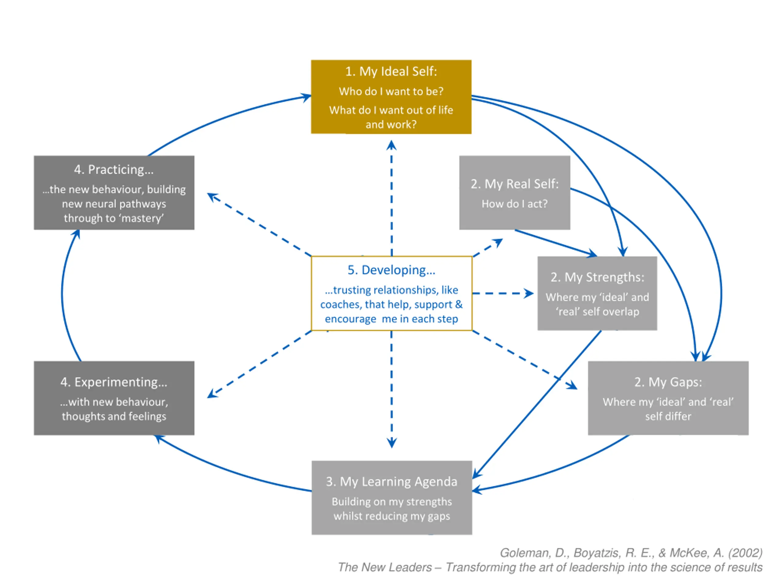 1. My Ideal Self: Who do I want to be? What do I want out of life and work? 4. Practicing 2. My Real Self: the new behaviour, building new neural pathways through to mastery How do I act? 5. Developing 2. My Strengths: trusting relationships, like coaches, that help, support & encourage me in each step Where my ideal and real self overlap 4. Experimenting 2. My Gaps: with new behaviour, thoughts and feelings Where my ideal and real self differ 3. My Learning Agenda Building on my strengths whilst reducing my gaps Goleman, D., Boyatzis, R. E., & McKee, A. (2002) The New Leaders Transforming the art of leadership into the science of results