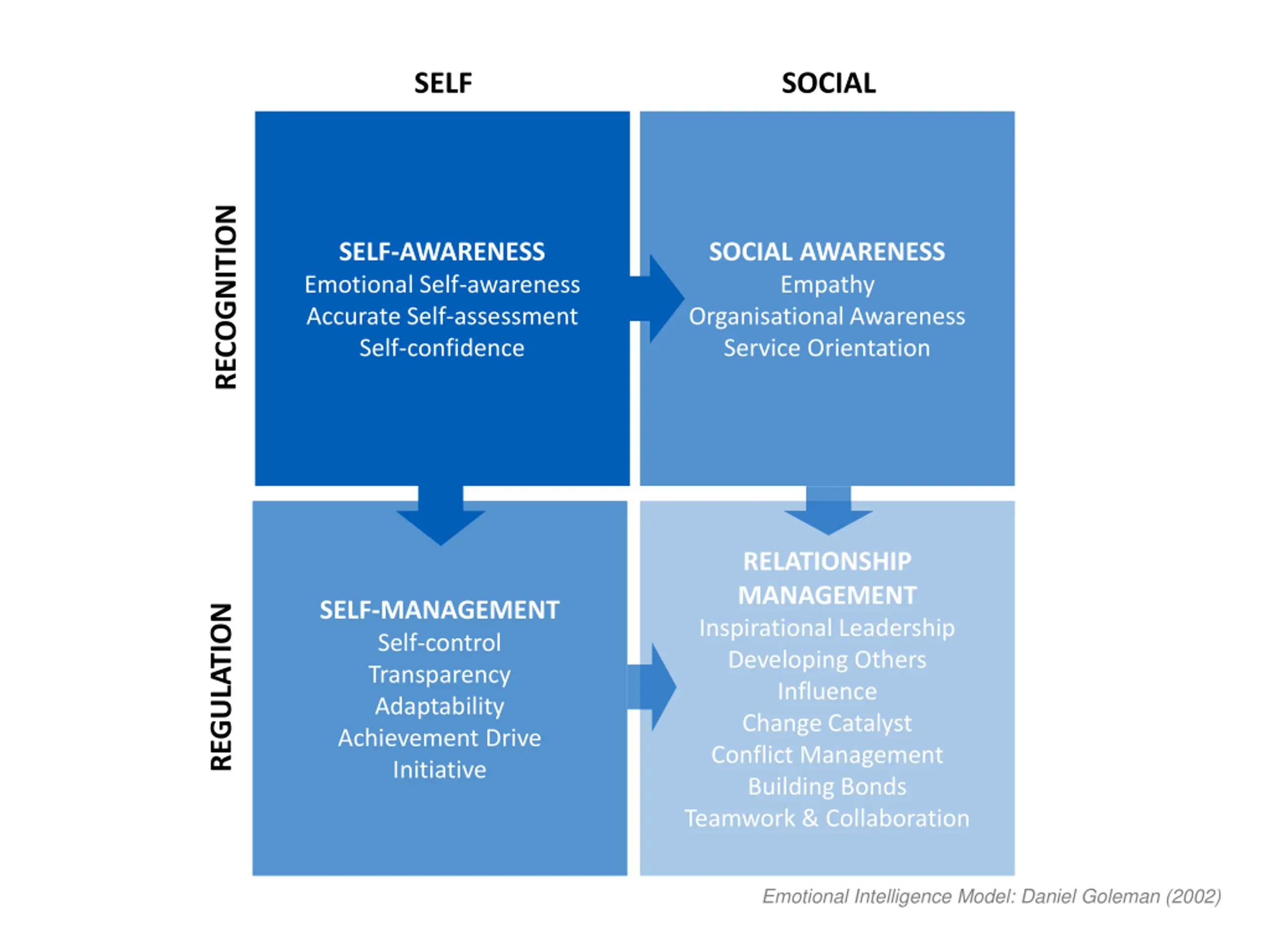 SELF SOCIAL RECOGNITION SELF-AWARENESS Emotional Self-awareness Accurate Self-assessment Self-confidence SOCIAL AWARENESS Empathy Organisational Awareness Service Orientation RELATIONSHIP MANAGEMENT Inspirational Leadership Developing Others Influence Change Catalyst Conflict Management Building Bonds Teamwork & Collaboration SELF-MANAGEMENT Self-control Transparency Adaptability Achievement Drive Initiative REGULATION Emotional Intelligence Model: Daniel Goleman (2002)