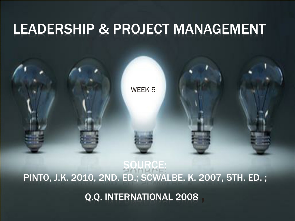 LEADERSHIP & PROJECT MANAGEMENT WEEK 5 SOURCE: PINTO, J.K. 2010, 2ND. ED.; SCWALBE, K. 2007, 5TH. ED. ; Q.Q. INTERNATIONAL 2008 ,