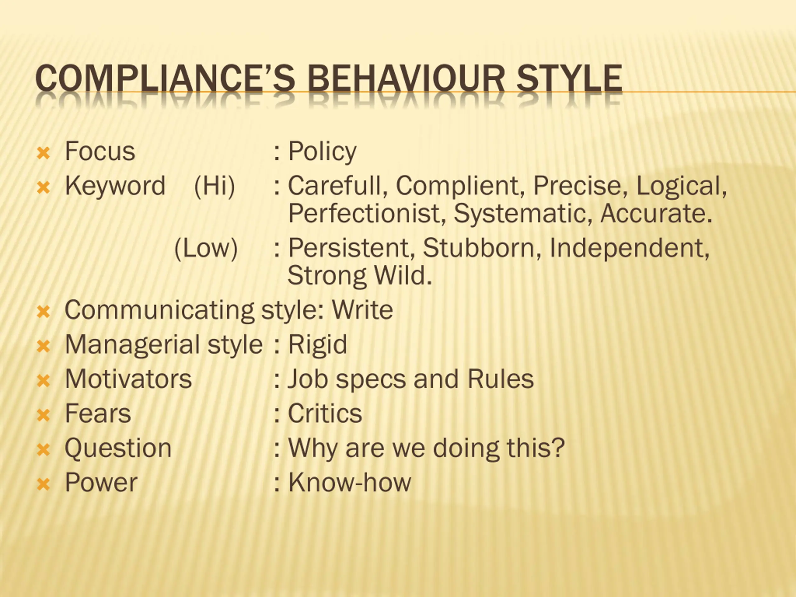 COMPLIANCES BEHAVIOUR STYLE Focus Keyword (Hi) : Policy : Carefull, Complient, Precise, Logical, Perfectionist, Systematic, Accurate. : Persistent, Stubborn, Independent, Strong Wild. (Low) Communicating style: Write Managerial style : Rigid Motivators Fears Question Power : Job specs and Rules : Critics : Why are we doing this? : Know-how