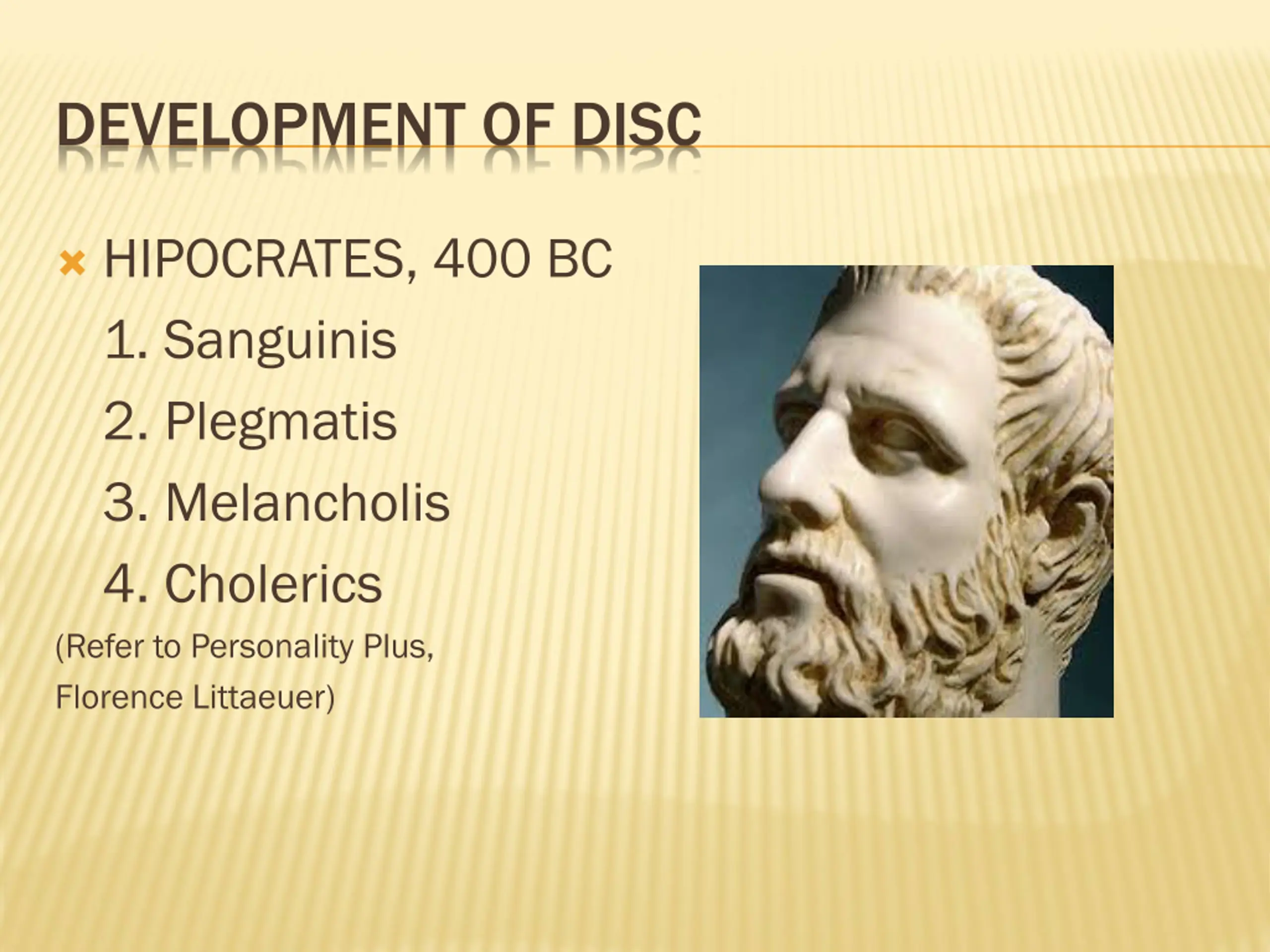 DEVELOPMENT OF DISC HIPOCRATES, 400 BC 1. Sanguinis 2. Plegmatis 3. Melancholis 4. Cholerics (Refer to Personality Plus, Florence Littaeuer)