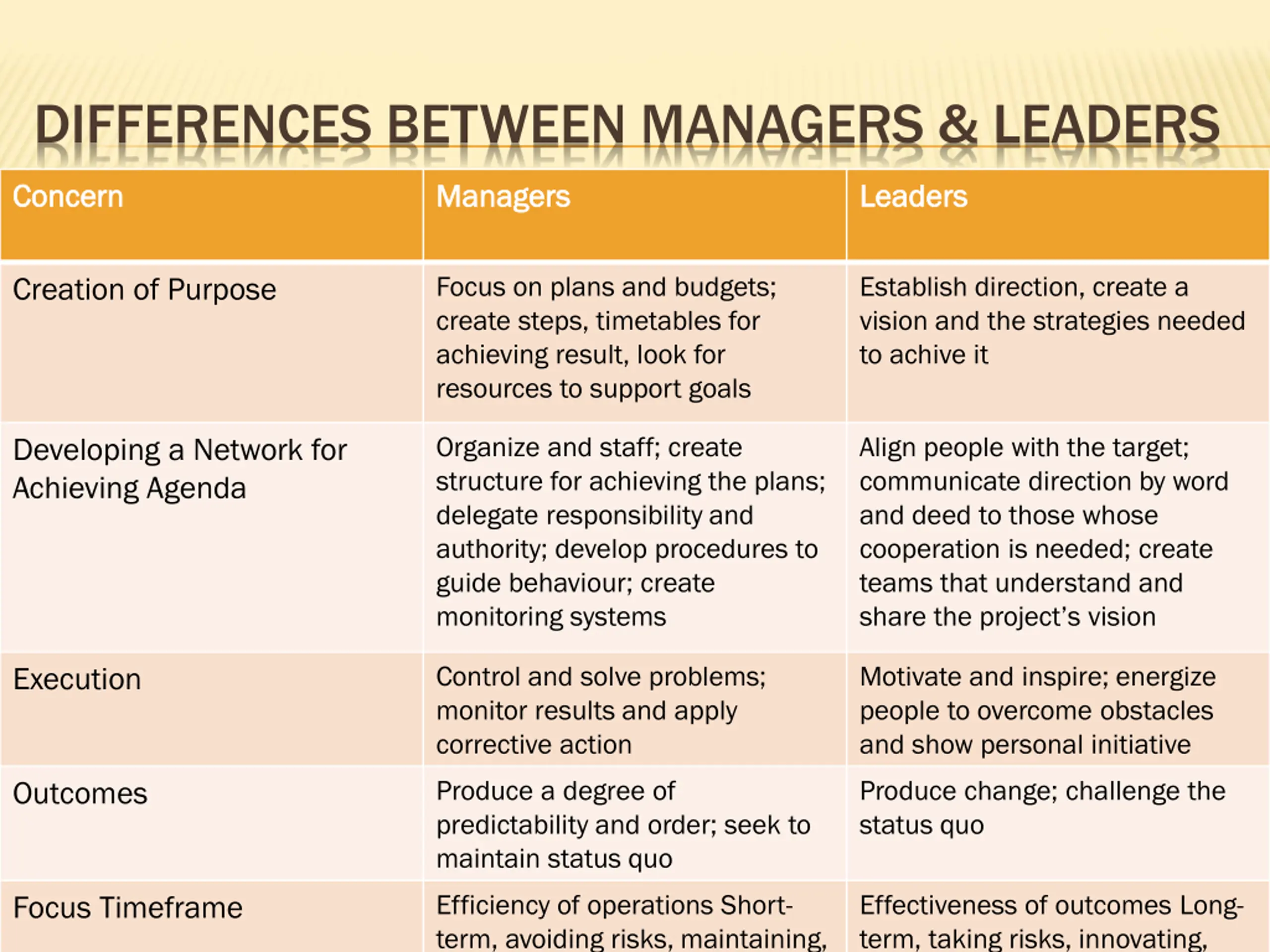 DIFFERENCES BETWEEN MANAGERS & LEADERS Concern Concern Managers Managers Leaders Leaders Focus on plans and budgets; create steps, timetables for achieving result, look for resources to support goals Establish direction, create a vision and the strategies needed to achive it Creation of Purpose Organize and staff; create structure for achieving the plans; delegate responsibility and authority; develop procedures to guide behaviour; create monitoring systems Align people with the target; communicate direction by word and deed to those whose cooperation is needed; create teams that understand and share the project s vision Developing a Network for Achieving Agenda Control and solve problems; monitor results and apply corrective action Motivate and inspire; energize people to overcome obstacles and show personal initiative Execution Produce a degree of predictability and order; seek to maintain status quo Produce change; challenge the status quo Outcomes Efficiency of operations Short- term, avoiding risks, maintaining, Effectiveness of outcomes Long- term, taking risks, innovating, Focus Timeframe