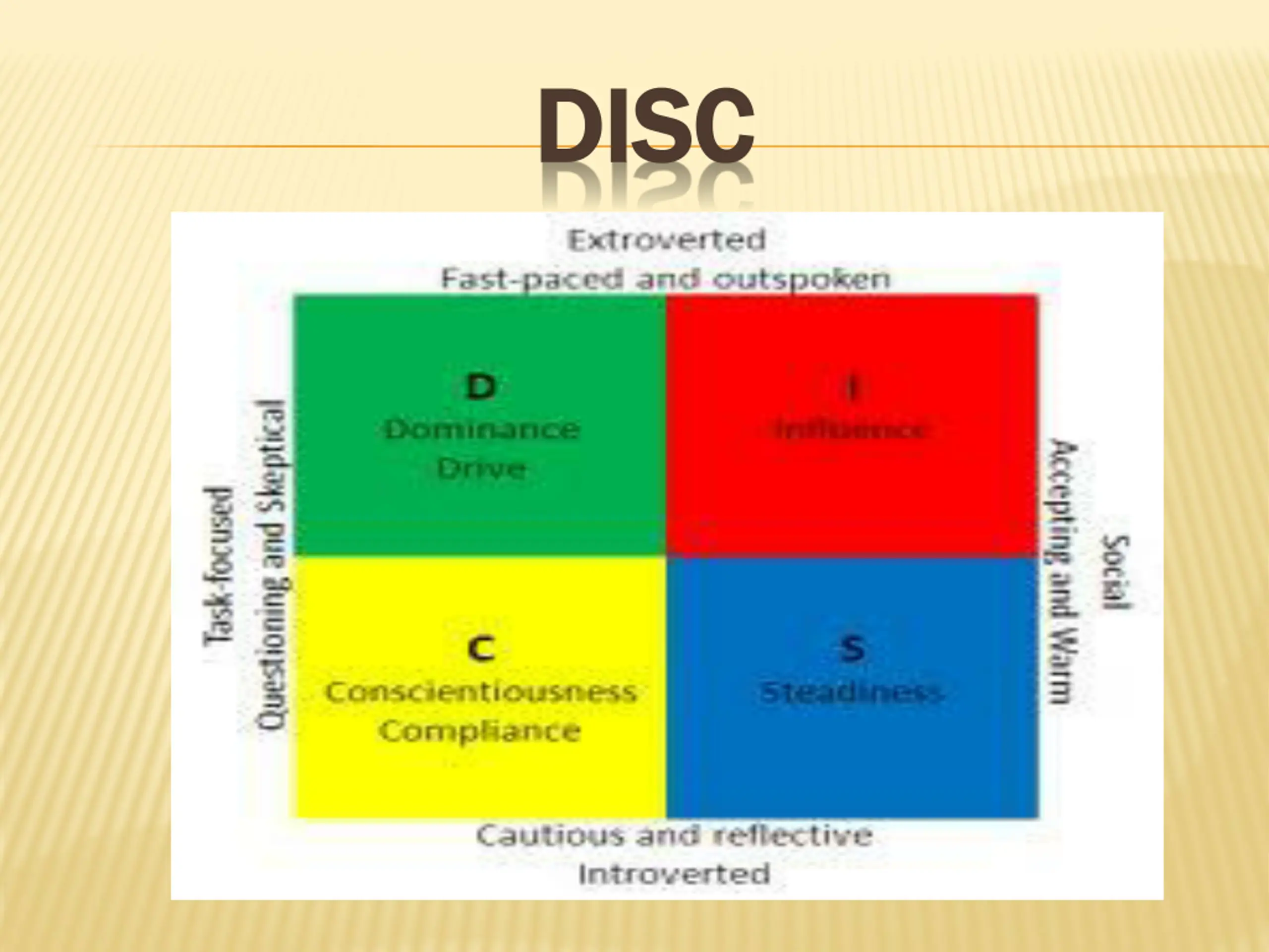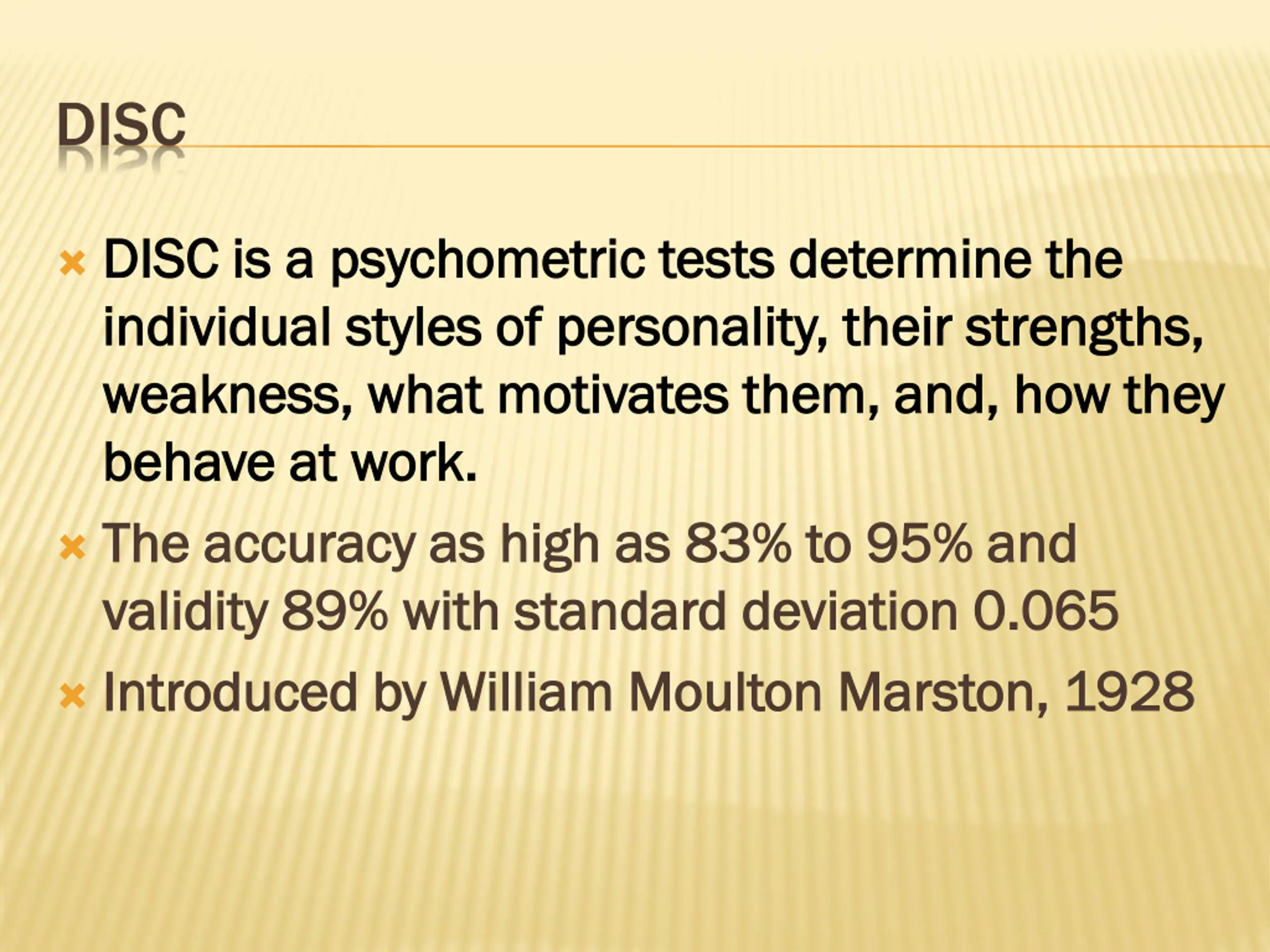 DISC DISC is a psychometric tests determine the DISC is a psychometric tests determine the individual styles of personality, their strengths, individual styles of personality, their strengths, weakness, what motivates them, and, how they weakness, what motivates them, and, how they behave at work. behave at work. The accuracy as high as 83% to 95% and The accuracy as high as 83% to 95% and validity 89% with standard deviation 0.065 validity 89% with standard deviation 0.065 Introduced by William Moulton Marston, 1928 Introduced by William Moulton Marston, 1928