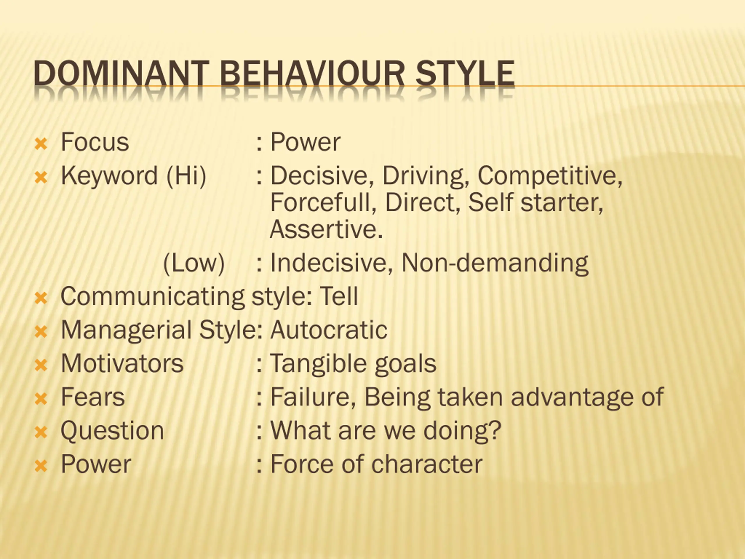 DOMINANT BEHAVIOUR STYLE Focus Keyword (Hi) (Low) : Indecisive, Non-demanding Communicating style: Tell Managerial Style: Autocratic Motivators : Tangible goals Fears : Failure, Being taken advantage of Question : What are we doing? Power : Force of character : Power : Decisive, Driving, Competitive, Forcefull, Direct, Self starter, Assertive.