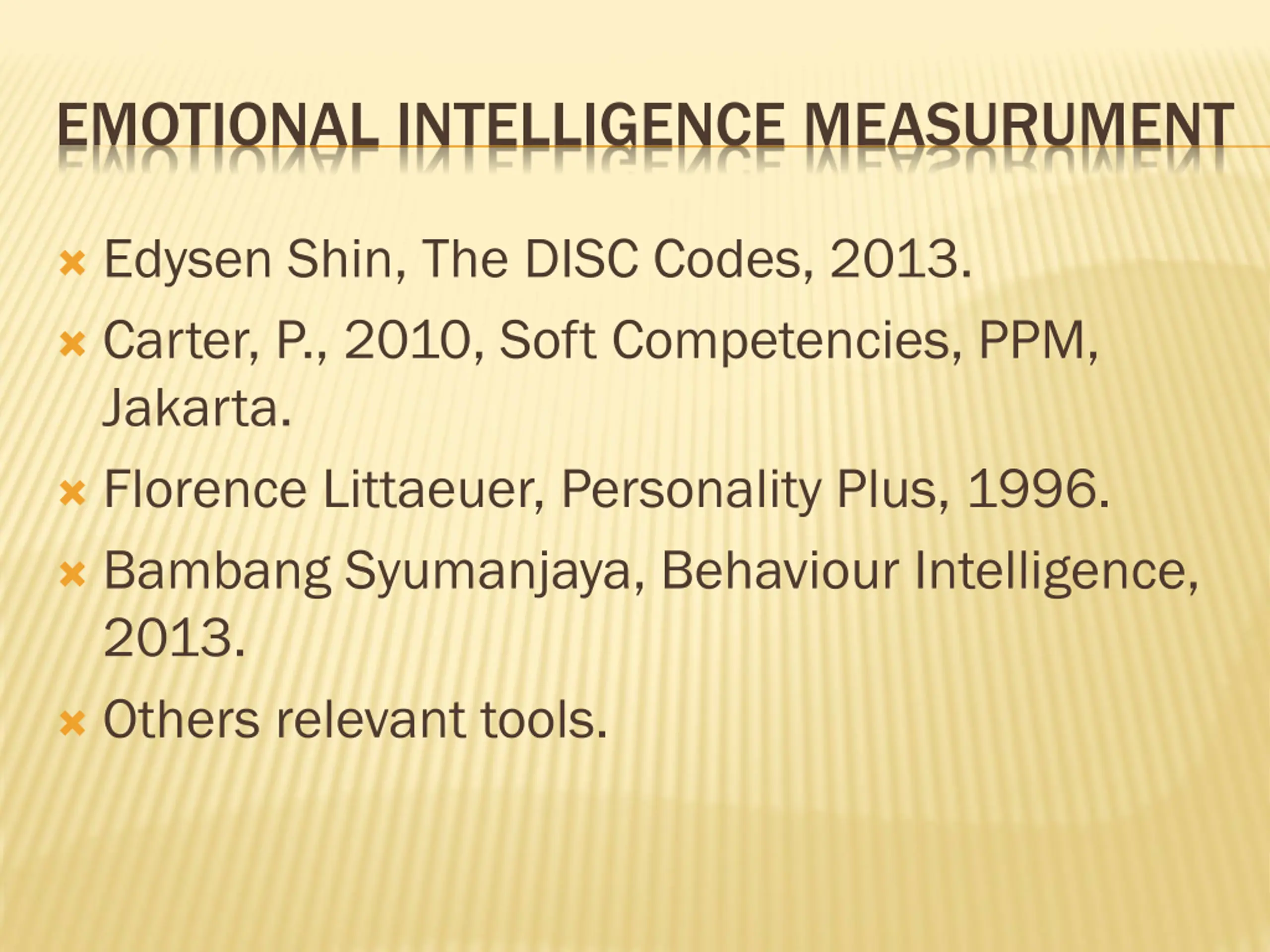 EMOTIONAL INTELLIGENCE MEASURUMENT Edysen Shin, The DISC Codes, 2013. Carter, P., 2010, Soft Competencies, PPM, Jakarta. Florence Littaeuer, Personality Plus, 1996. Bambang Syumanjaya, Behaviour Intelligence, 2013. Others relevant tools.