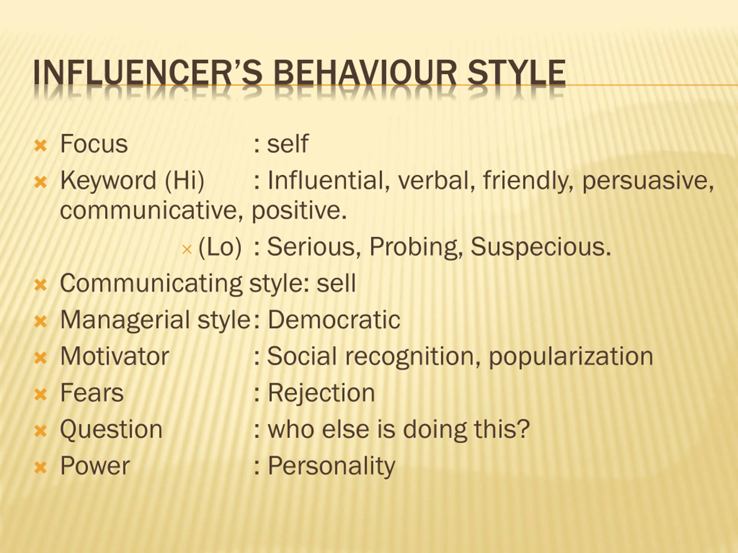 INFLUENCERS BEHAVIOUR STYLE Focus Keyword (Hi) communicative, positive. (Lo) : Serious, Probing, Suspecious. Communicating style: sell Managerial style : Democratic Motivator : Social recognition, popularization Fears : Rejection Question : who else is doing this? Power : Personality : self : Influential, verbal, friendly, persuasive,