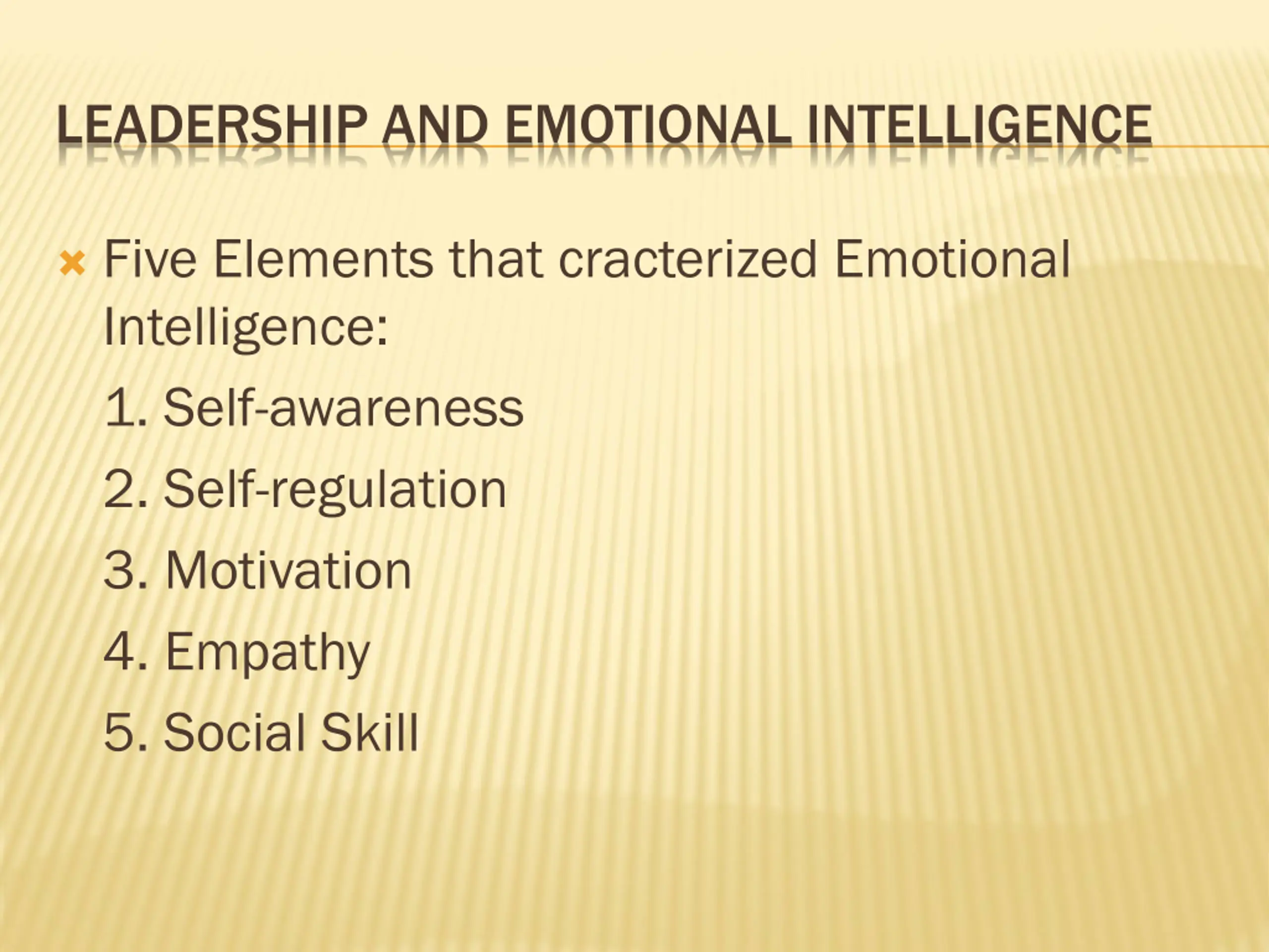 LEADERSHIP AND EMOTIONAL INTELLIGENCE Five Elements that cracterized Emotional Intelligence: 1. Self-awareness 2. Self-regulation 3. Motivation 4. Empathy 5. Social Skill