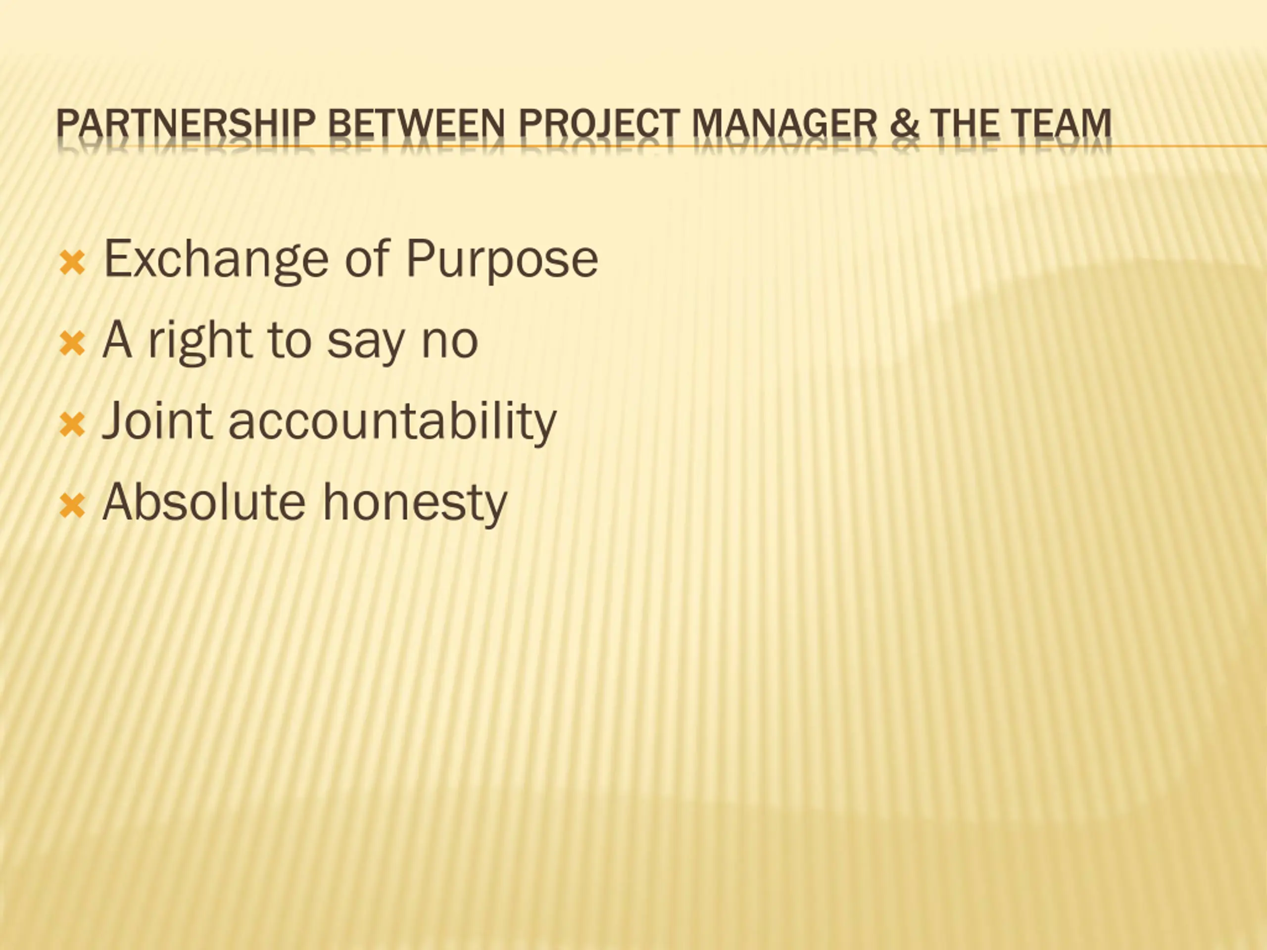 PARTNERSHIP BETWEEN PROJECT MANAGER & THE TEAM Exchange of Purpose A right to say no Joint accountability Absolute honesty