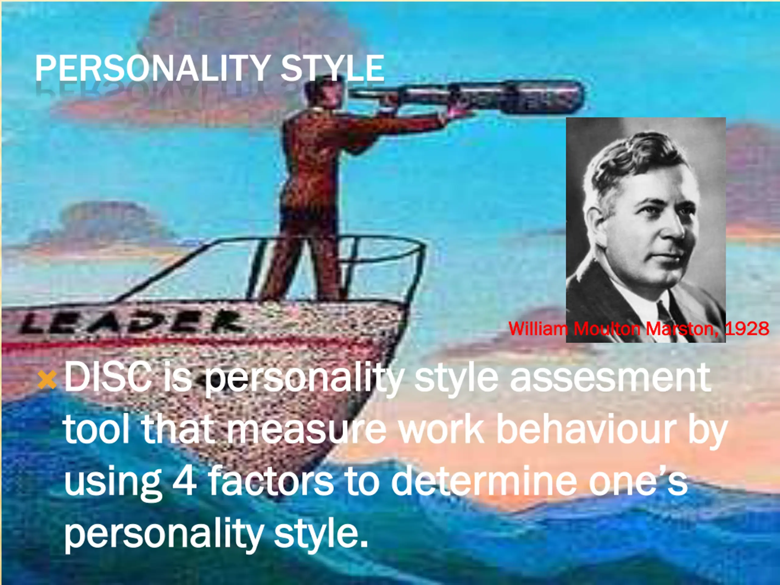 PERSONALITY STYLE William Moulton Marston, 1928 William Moulton Marston, 1928 DISC is personality style assesment DISC is personality style assesment tool that measure work behaviour by tool that measure work behaviour by using 4 factors to determine one s using 4 factors to determine one s personality style. personality style.