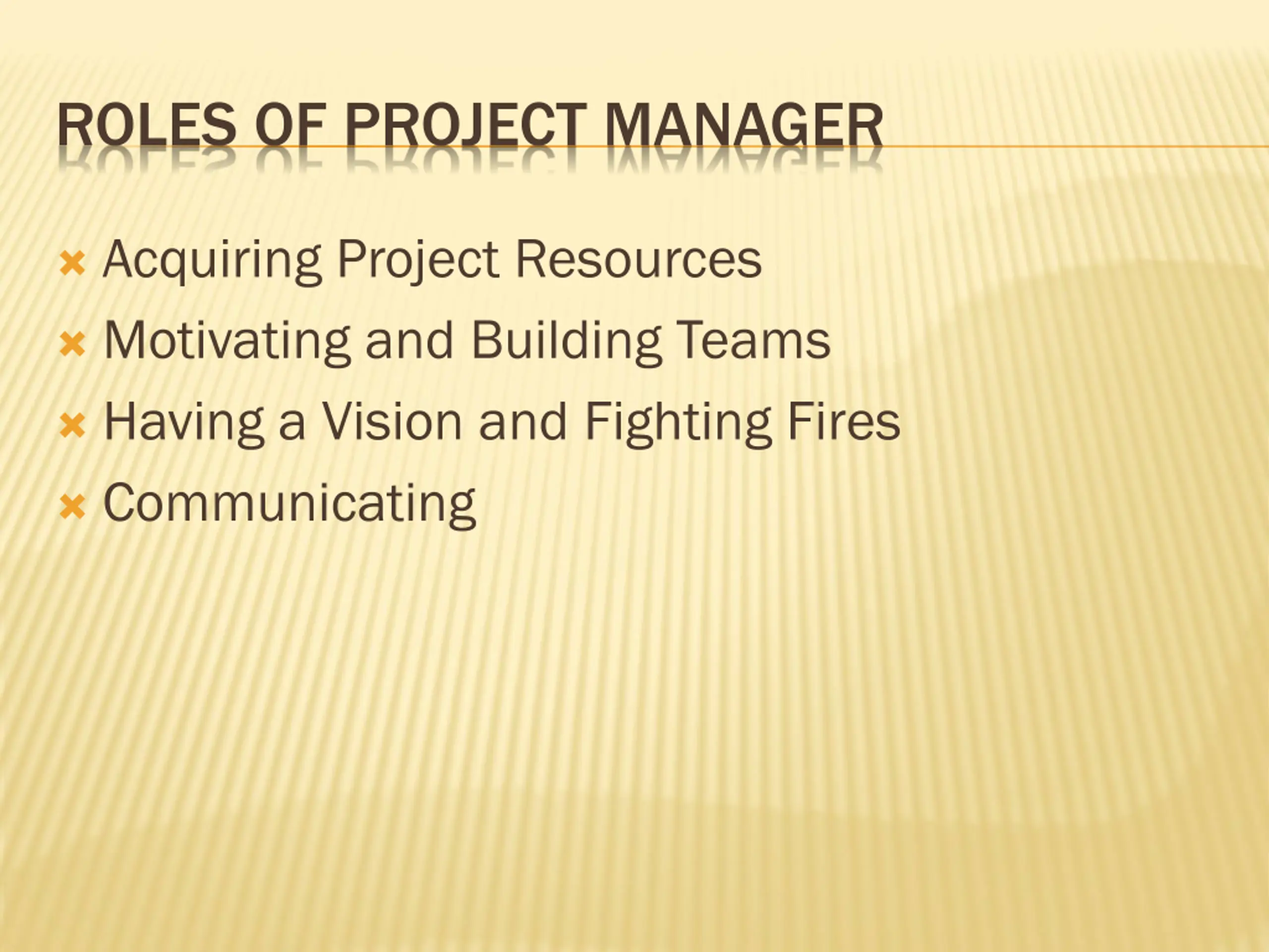 ROLES OF PROJECT MANAGER Acquiring Project Resources Motivating and Building Teams Having a Vision and Fighting Fires Communicating