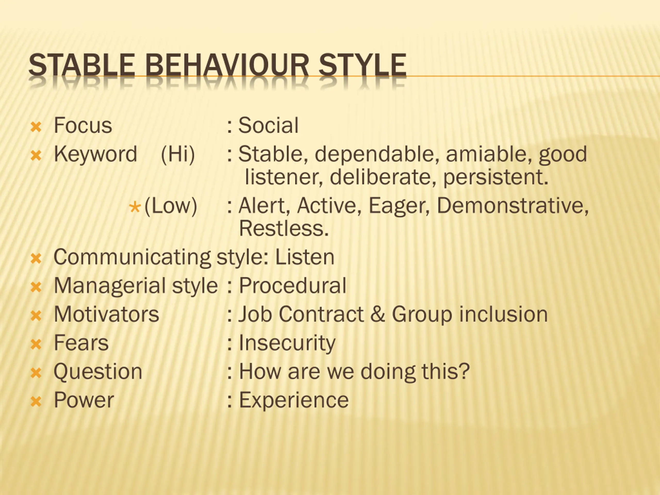 STABLE BEHAVIOUR STYLE Focus Keyword (Hi) : Social : Stable, dependable, amiable, good listener, deliberate, persistent. : Alert, Active, Eager, Demonstrative, Restless. (Low) Communicating style: Listen Managerial style : Procedural Motivators Fears Question Power : Job Contract & Group inclusion : Insecurity : How are we doing this? : Experience