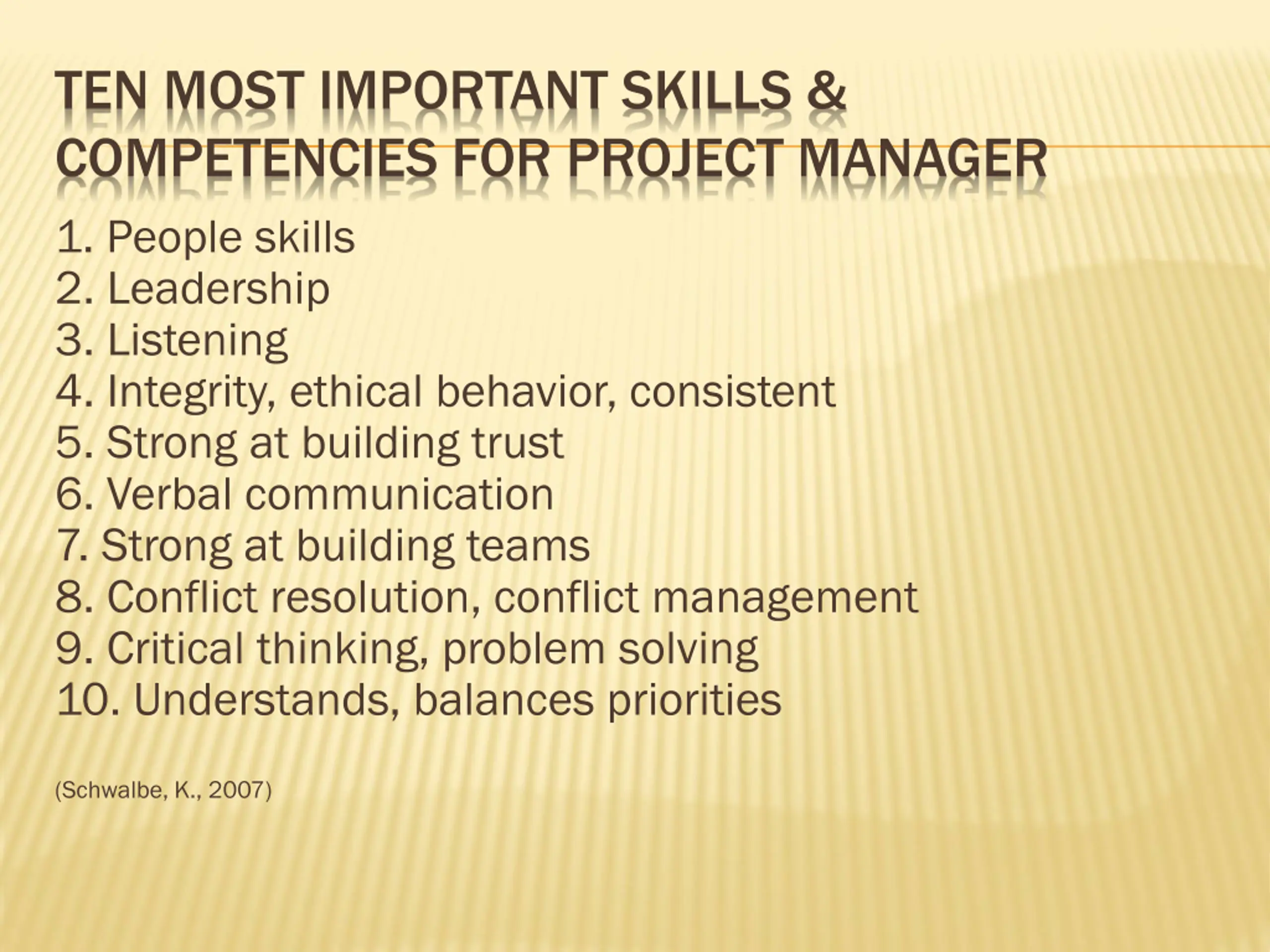 TEN MOST IMPORTANT SKILLS & COMPETENCIES FOR PROJECT MANAGER 1. People skills 2. Leadership 3. Listening 4. Integrity, ethical behavior, consistent 5. Strong at building trust 6. Verbal communication 7. Strong at building teams 8. Conflict resolution, conflict management 9. Critical thinking, problem solving 10. Understands, balances priorities (Schwalbe, K., 2007)