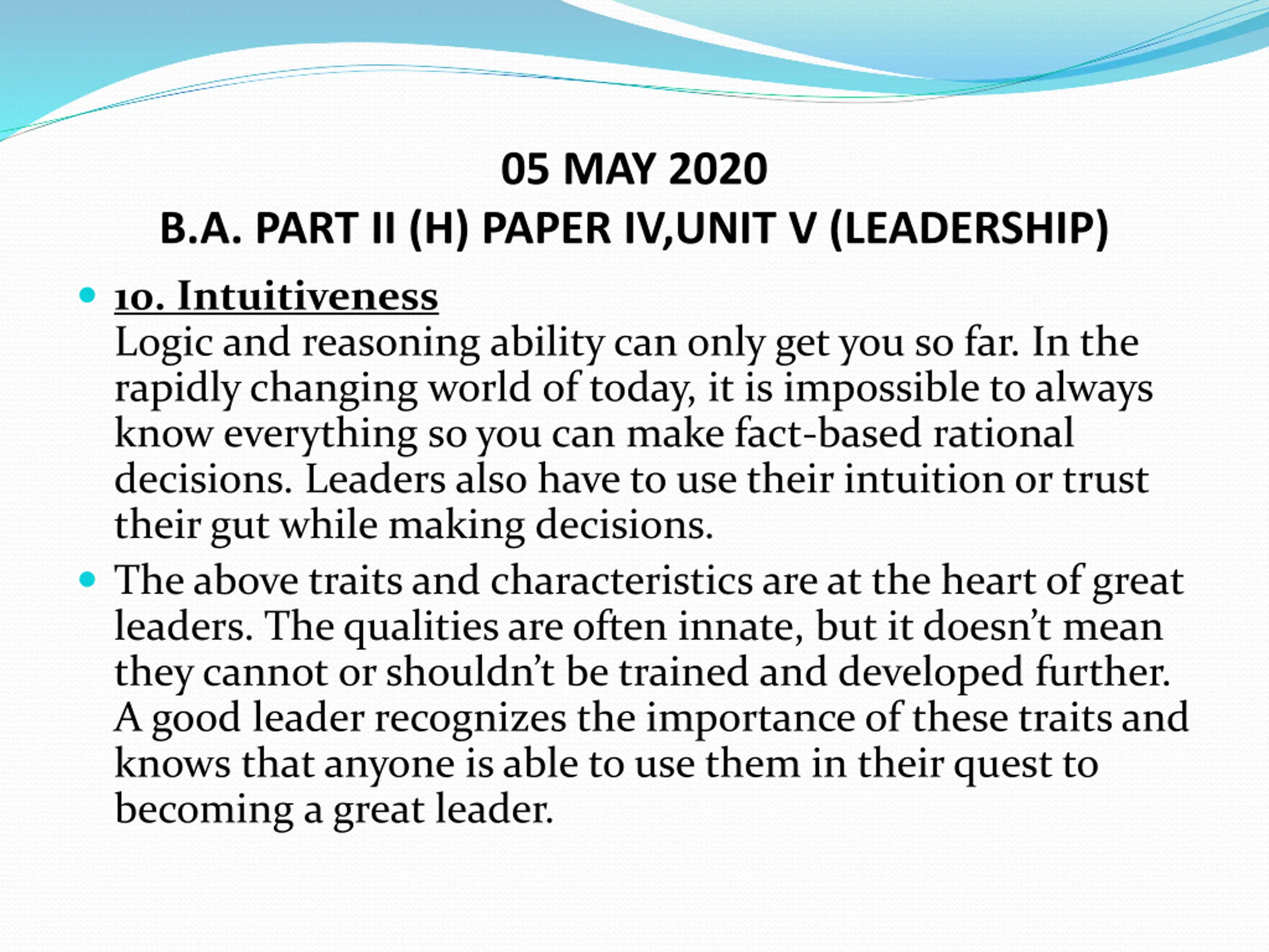 05 MAY 2020 B.A. PART II (H) PAPER IV,UNIT V (LEADERSHIP) 10. Intuitiveness Logic and reasoning ability can only get you so far. In the rapidly changing world of today, it is impossible to always know everything so you can make fact-based rational decisions. Leaders also have to use their intuition or trust their gut while making decisions. The above traits and characteristics are at the heart of great leaders. The qualities are often innate, but it doesn t mean they cannot or shouldn t be trained and developed further. A good leader recognizes the importance of these traits and knows that anyone is able to use them in their quest to becoming a great leader.