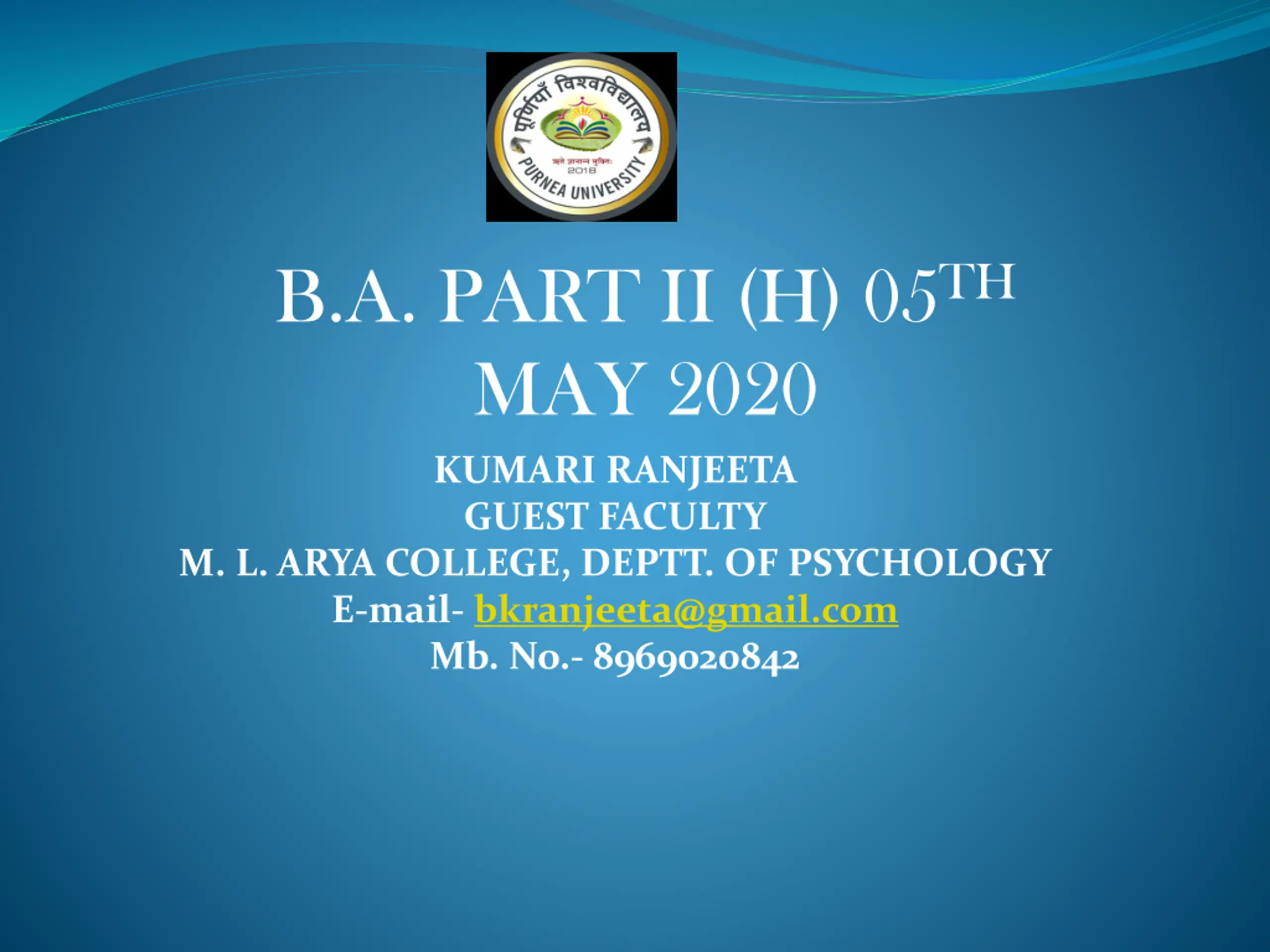 B.A. PART II (H) 05TH MAY 2020 KUMARI RANJEETA GUEST FACULTY M. L. ARYA COLLEGE, DEPTT. OF PSYCHOLOGY E-mail- bkranjeeta@gmail.com Mb. No.- 8969020842