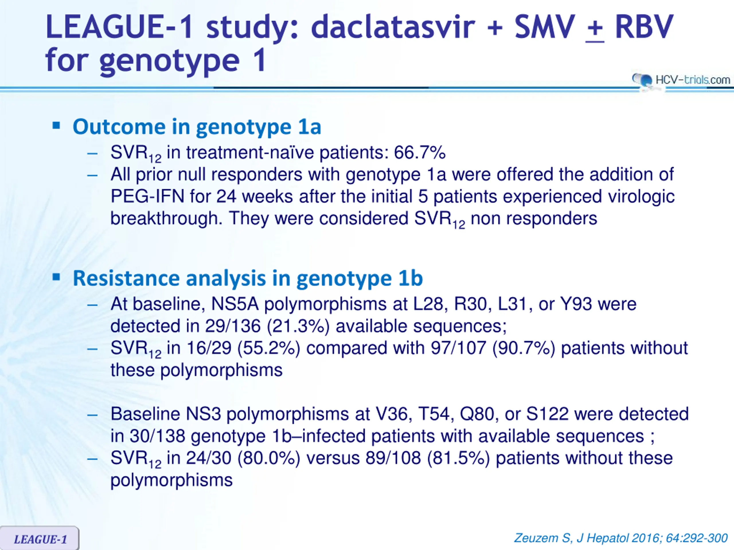 LEAGUE-1 study: daclatasvir + SMV + RBV for genotype 1 Outcome in genotype 1a SVR12in treatment-na ve patients: 66.7% All prior null responders with genotype 1a were offered the addition of PEG-IFN for 24 weeks after the initial 5 patients experienced virologic breakthrough. They were considered SVR12non responders Resistance analysis in genotype 1b At baseline, NS5A polymorphisms at L28, R30, L31, or Y93 were detected in 29/136 (21.3%) available sequences; SVR12in 16/29 (55.2%) compared with 97/107 (90.7%) patients without these polymorphisms Baseline NS3 polymorphisms at V36, T54, Q80, or S122 were detected in 30/138 genotype 1b infected patients with available sequences ; SVR12in 24/30 (80.0%) versus 89/108 (81.5%) patients without these polymorphisms Zeuzem S, J Hepatol 2016; 64:292-300 LEAGUE-1
