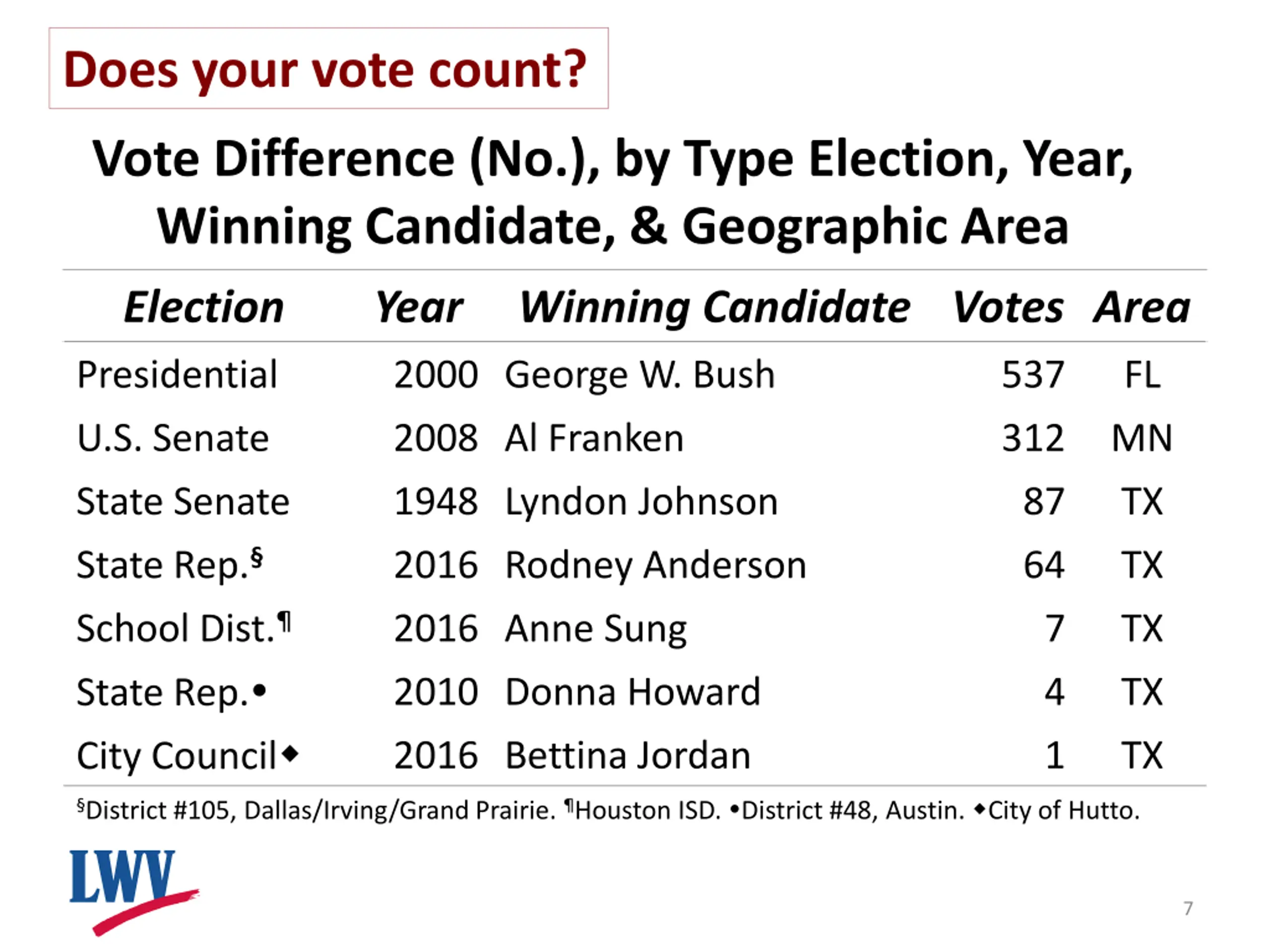 Does your vote count? Vote Difference (No.), by Type Election, Year, Winning Candidate, & Geographic Area Election Year Winning Candidate Votes Area Presidential 2000 George W. Bush 537 FL U.S. Senate 2008 Al Franken 312 MN State Senate State Rep. School Dist. State Rep. City Council 1948 Lyndon Johnson 87 TX 2016 Rodney Anderson 64 TX 2016 Anne Sung 7 TX 2010 Donna Howard 4 TX 2016 Bettina Jordan 1 TX District #105, Dallas/Irving/Grand Prairie. Houston ISD. District #48, Austin. City of Hutto. 7