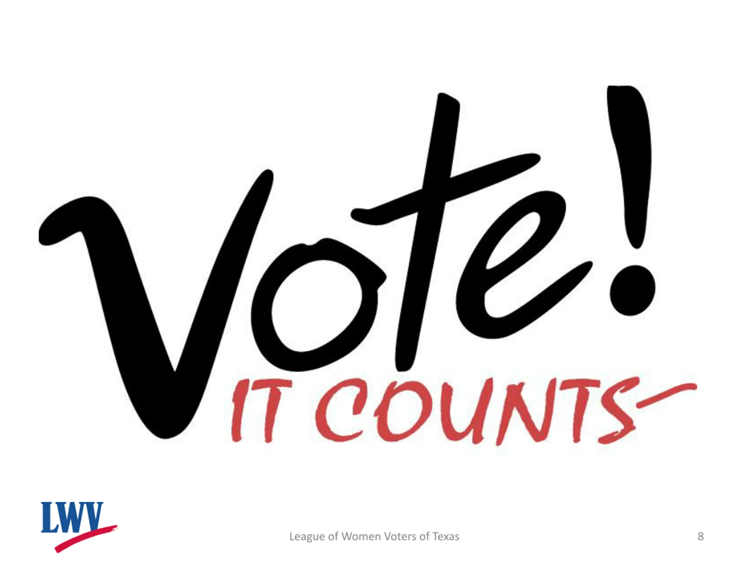 Voter Information Websites VoteTexas.gov Texas Secretary of State 1-800-252-VOTE Who When Where - How - What VOTE411.org Election Information You Need Enter your address to get personalized election information HarrisVotes.com Harris County Elections Department LWVTexas.org A nonpartisan resource for voting & public policy issues 713-755-6965 for polling places & sample ballots Facebook.com/LWVCyFair League of Women Voters 10