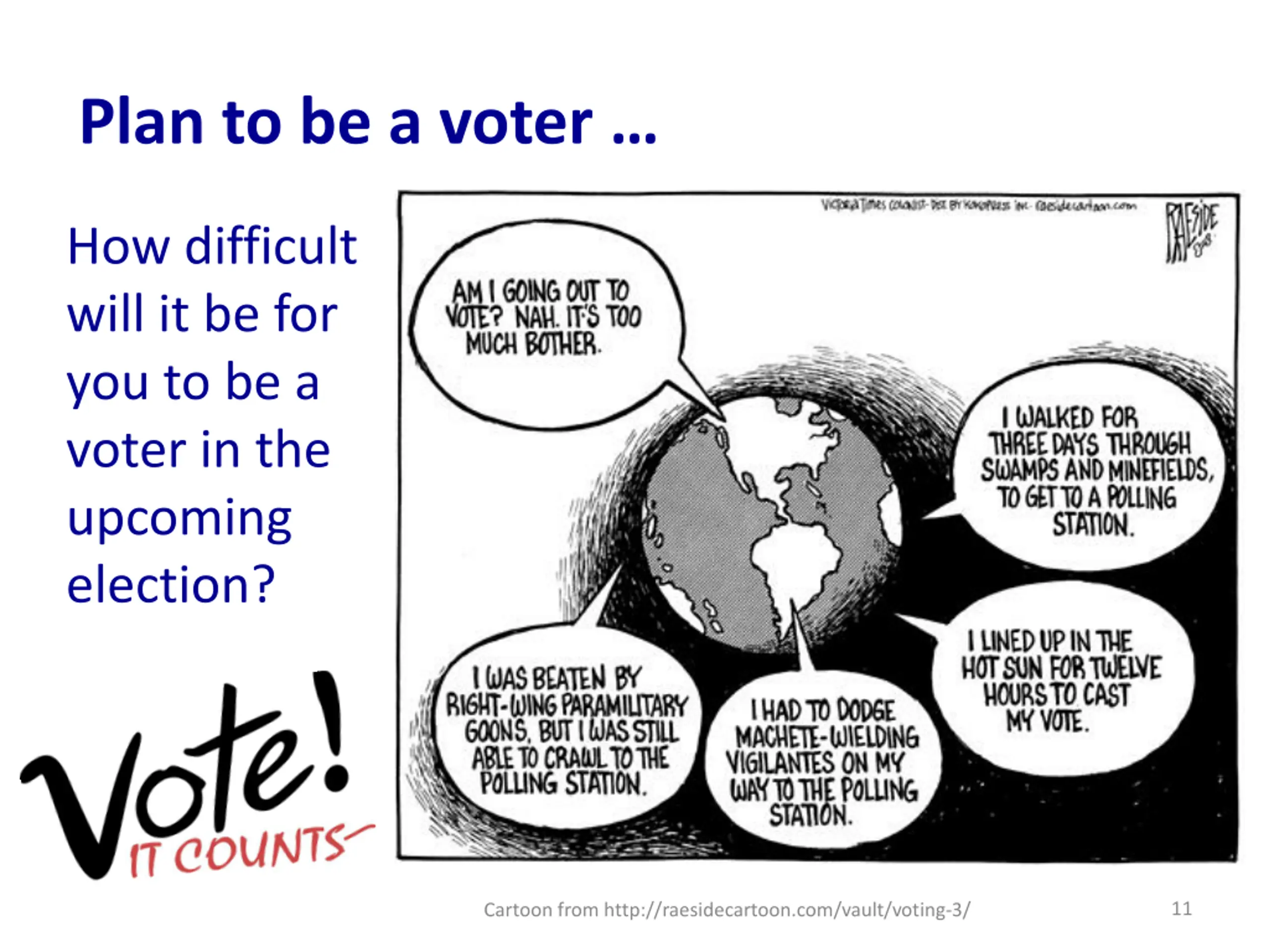 Plan to be a voter How difficult will it be for you to be a voter in the upcoming election? 11 Cartoon from http://raesidecartoon.com/vault/voting-3/